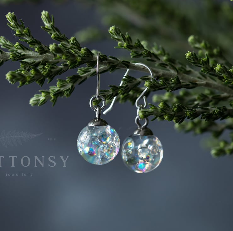 A beautiful pair of iridescent bubble resin earrings, in solid sterling silver.