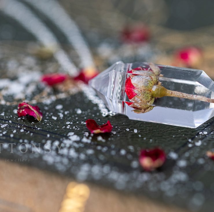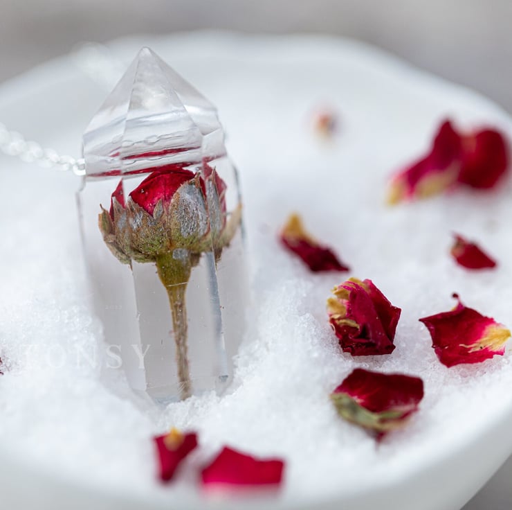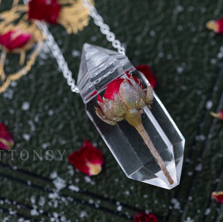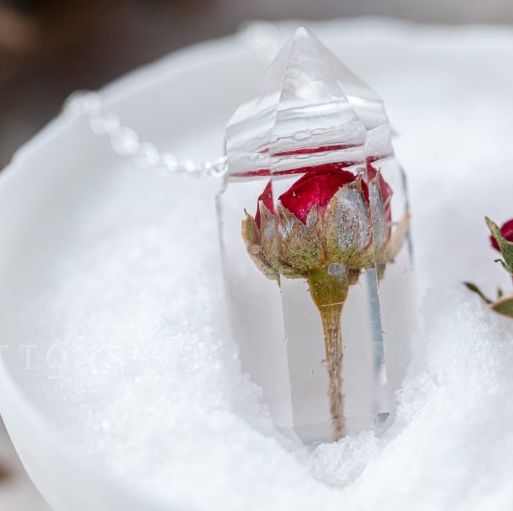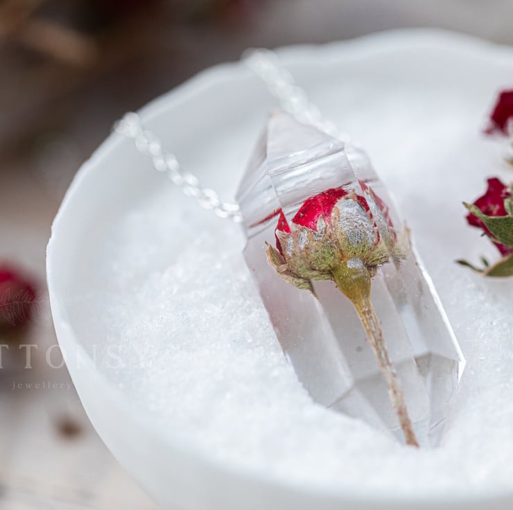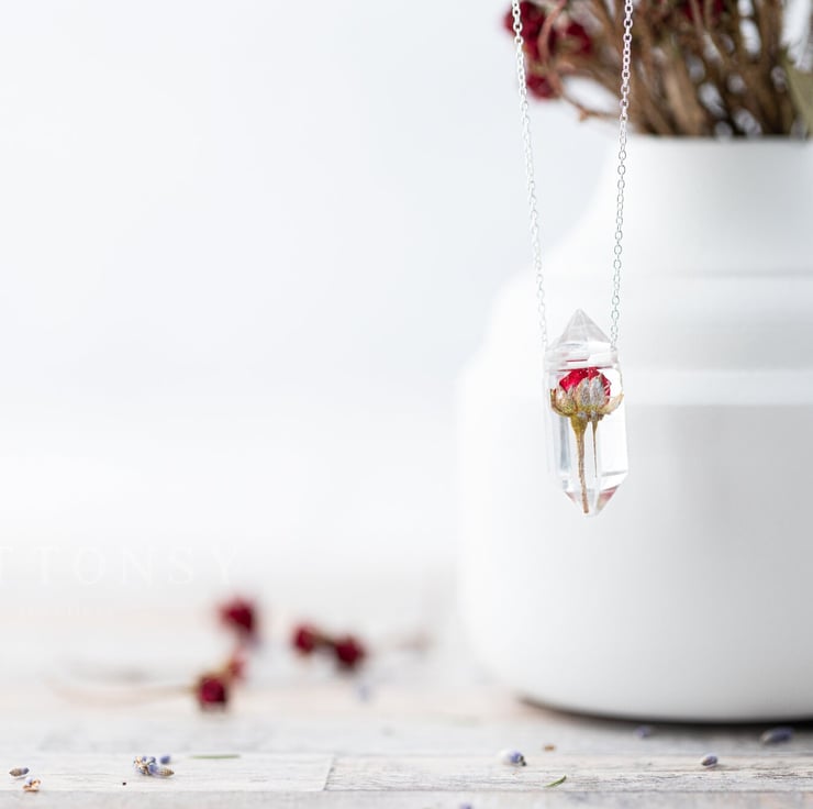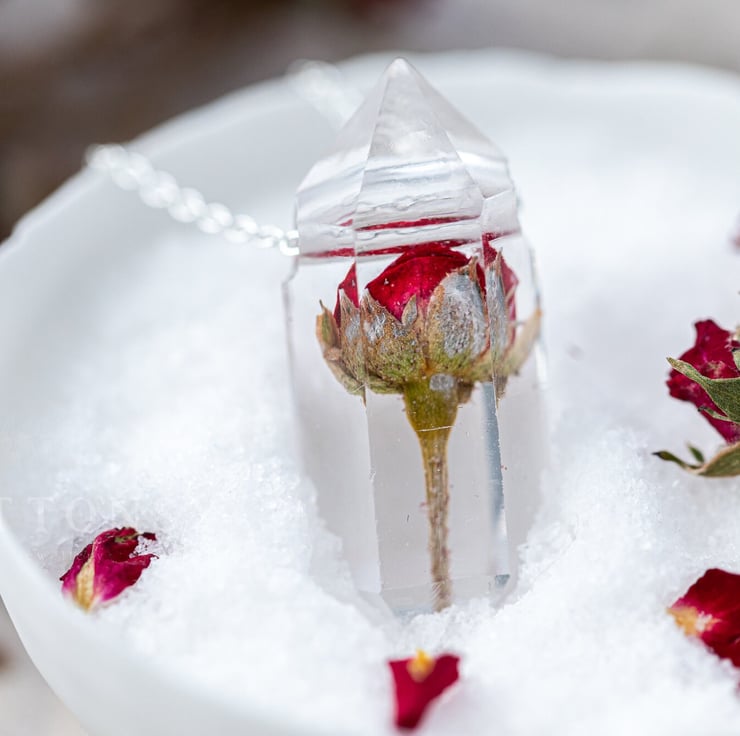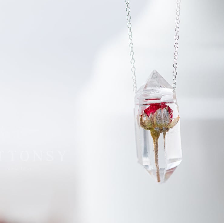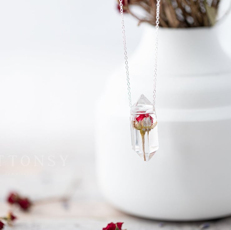 Rose Necklace "Raw Crystal" Pressed Flower Jewelry Gifts For Her Red Roses Roseb
