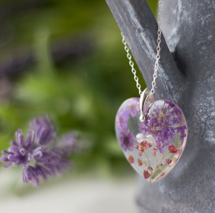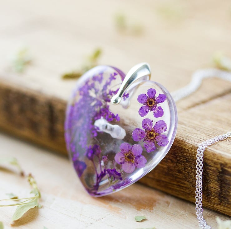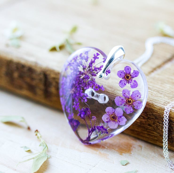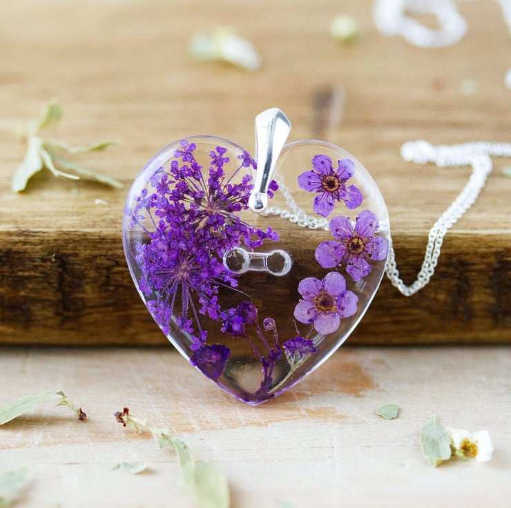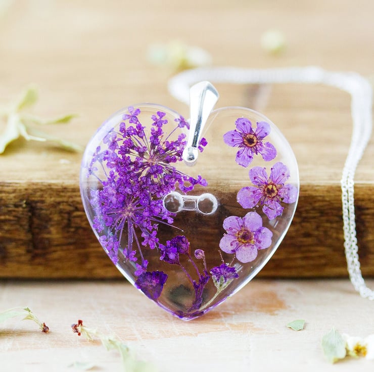 This beautiful necklace is one of a collection with each colour of the rainbow... each heart is filled with perfect flowers that have been sealed and set in crystal clear resin so they permanently keep their gorgeous colours. Please do note, though, that while we will always use purple flowers, the precise shades of purple and the specific flowers will vary from necklace to necklace.