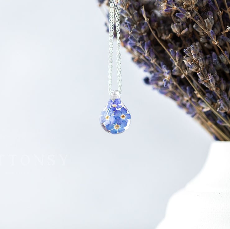 PLEASE NOTE: we also have this design with a single forget me not, but with the cluster, your necklace may have less or more flowers than 3 - it completely depends on the droplet, and the size of the flowers. If you want a specific number of flowers, please send us a message in advance so we can see what's possible. Thank you so much!