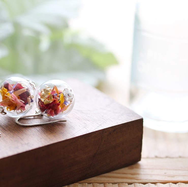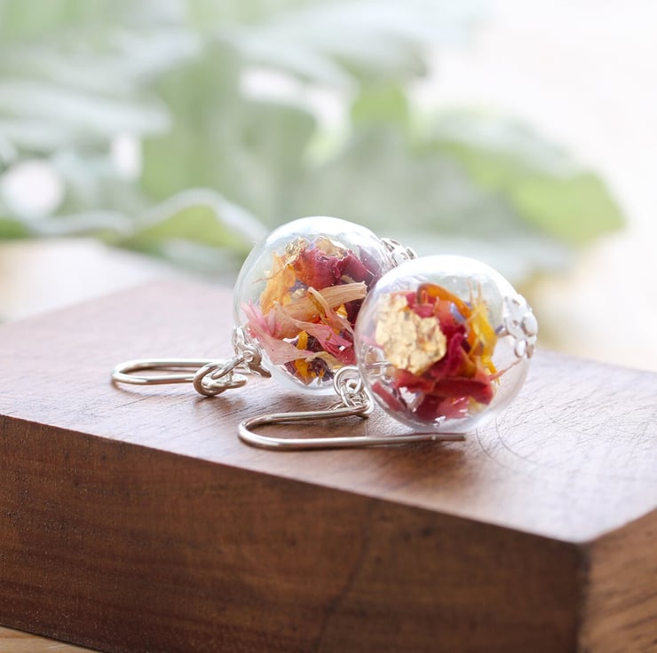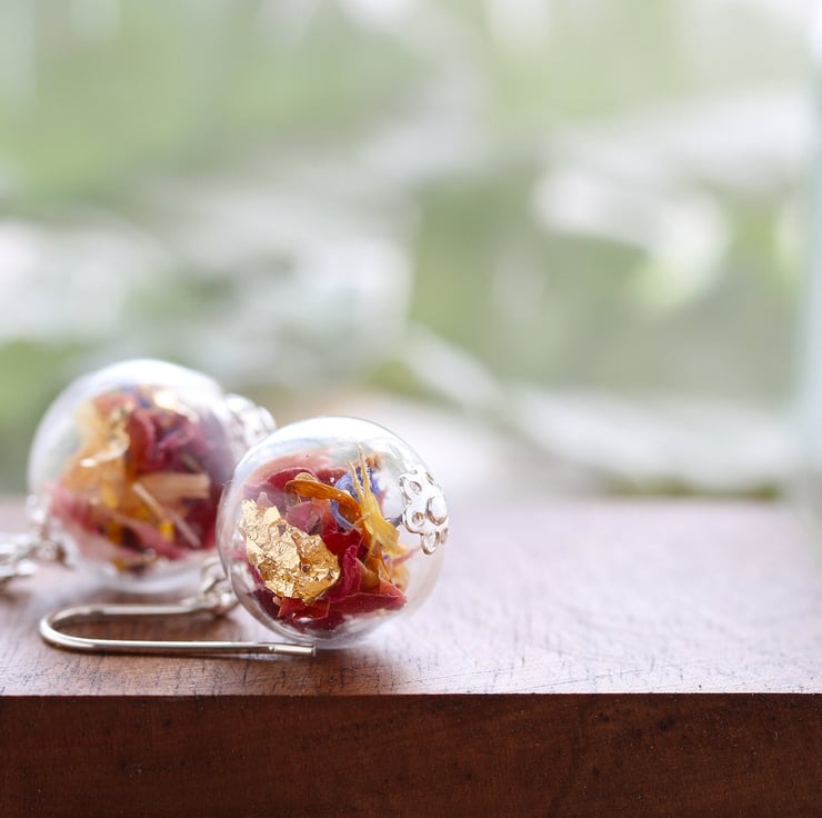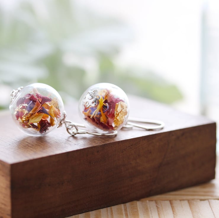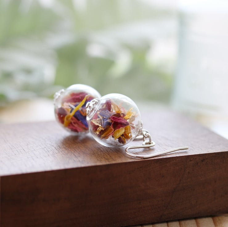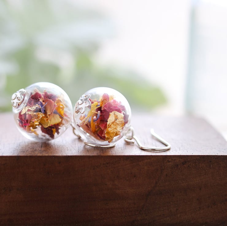 The flowers are in glass globes measuring 16mm across, and they hang from sterling silver ear wires.