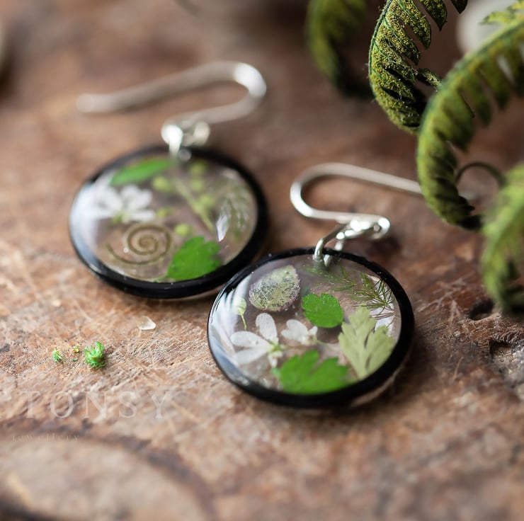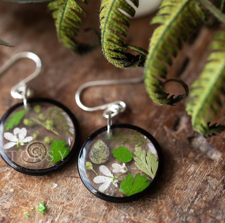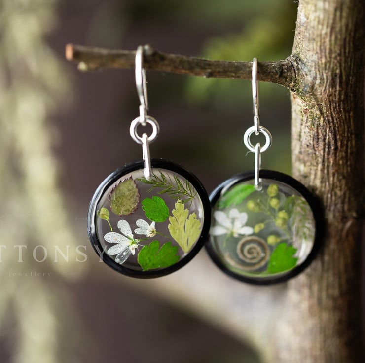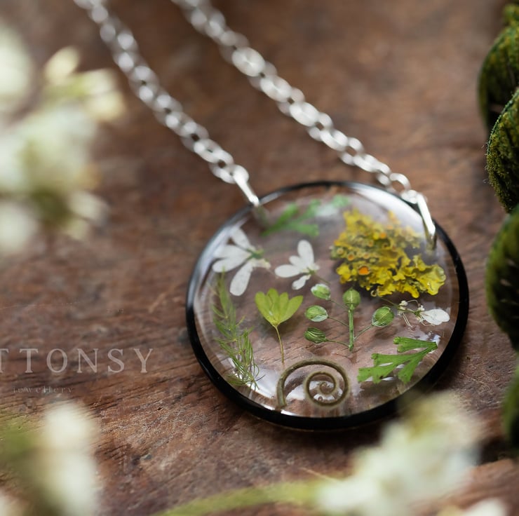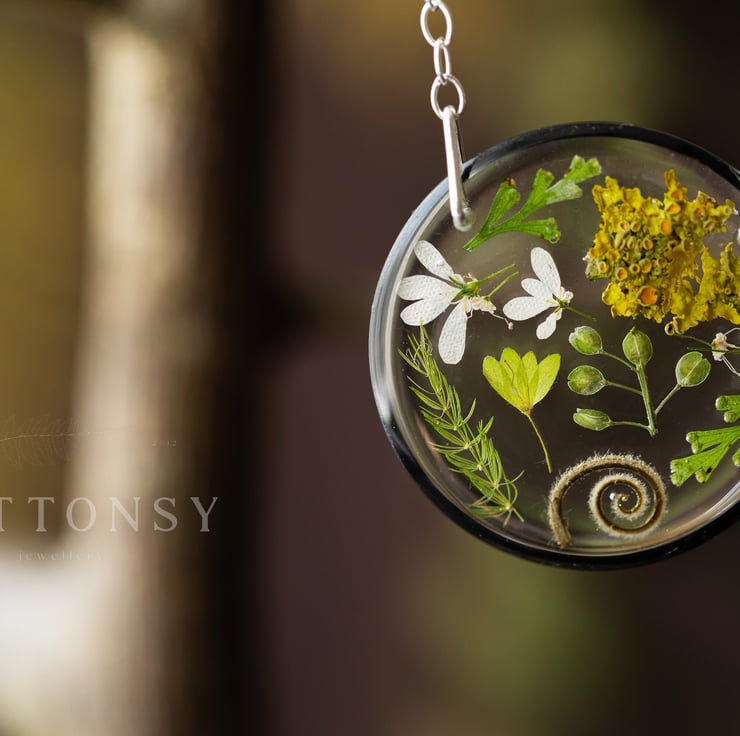 This beautiful piece of jewellery features fern, moss, lichen, British herbs, Queen Anne's Lace and a myriad others depending on the season.