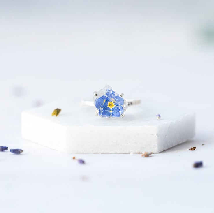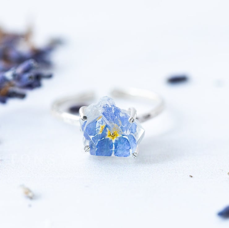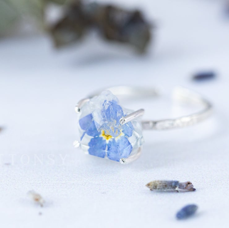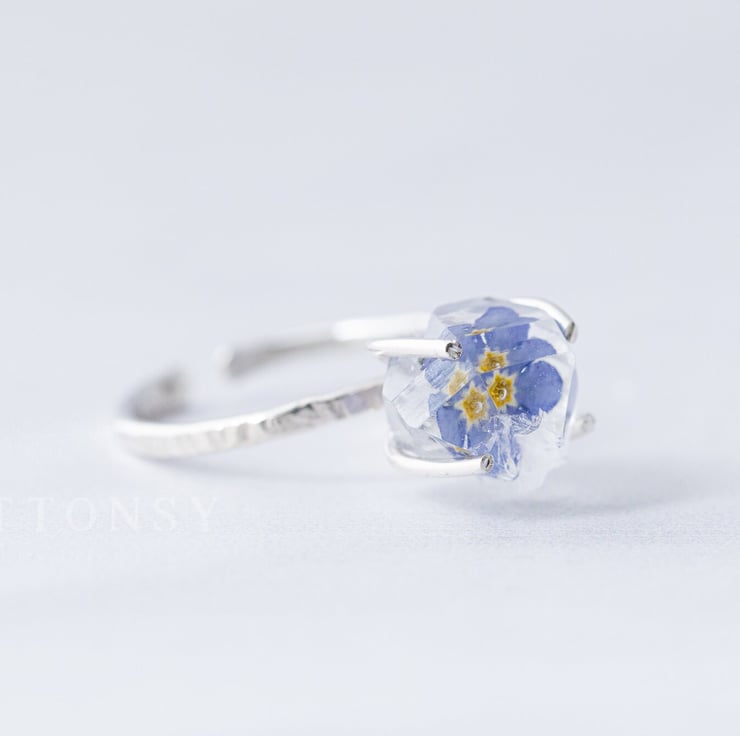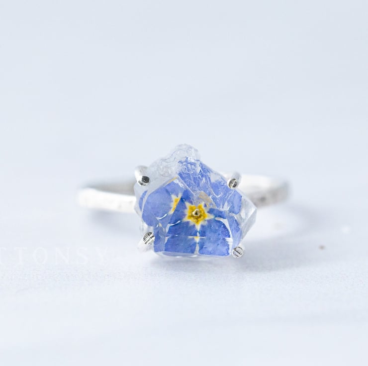 A hammered sterling silver band, ultra-skinny, perfect for stacking, topped with a perfect "raw Herkimer crystal" filled with one perfect blue, blue forget me not. This is a magical piece of jewellery... it's so beautifully delicate, and absolutely one of a kind.