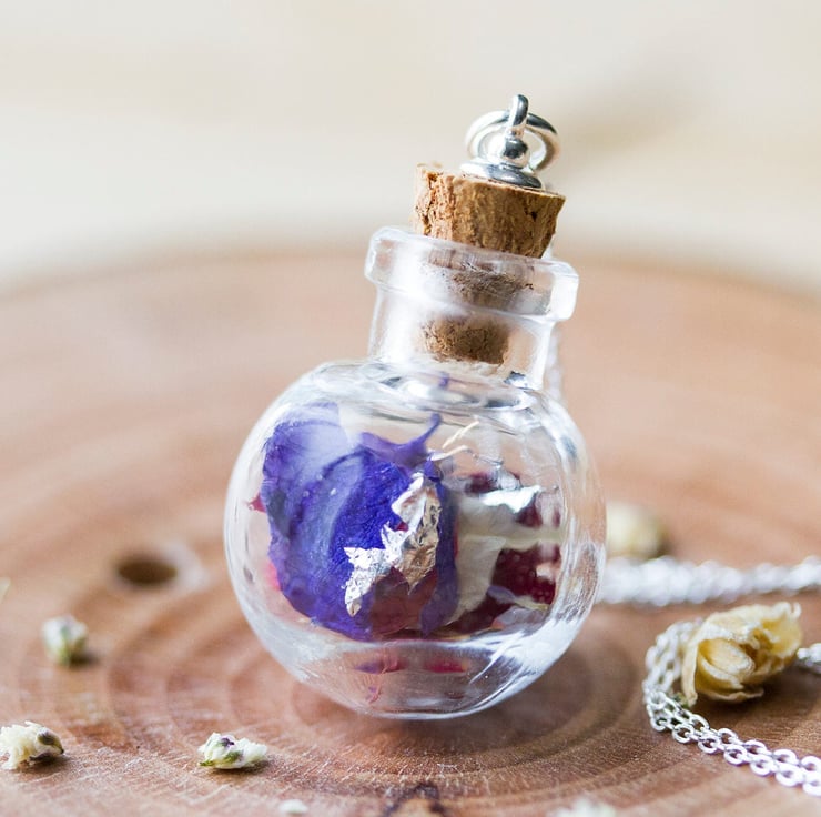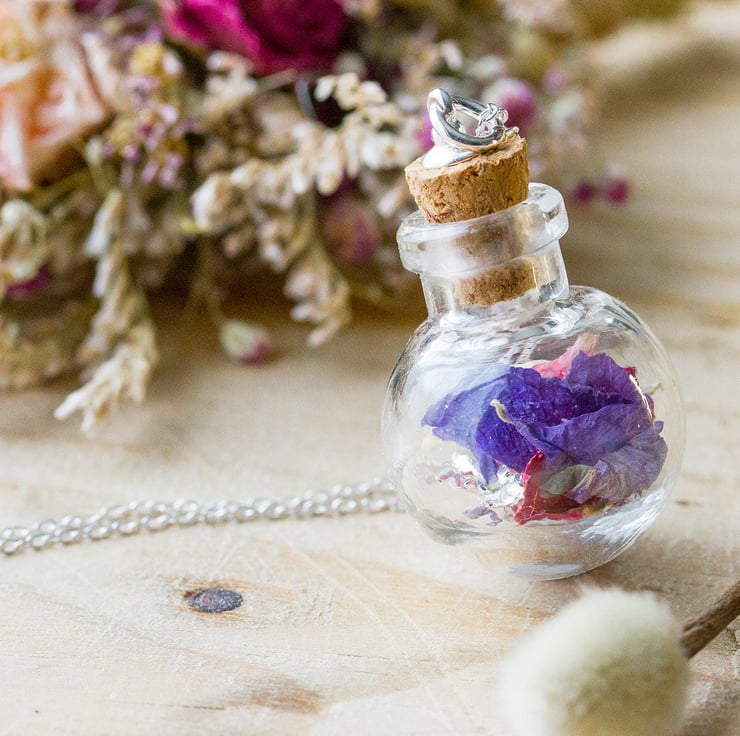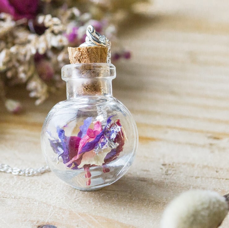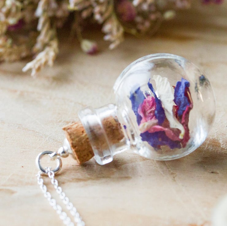 A glass globe, filled with dried wildflower petals in pinks, lilacs, purples, whites and blues. This is beautifully gentle, delicate jewellery - it carries summer and simple joy.