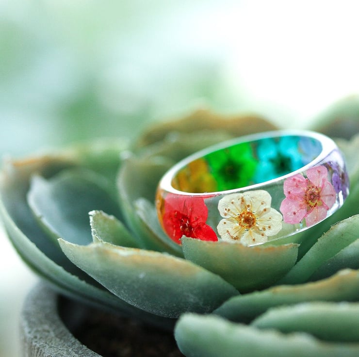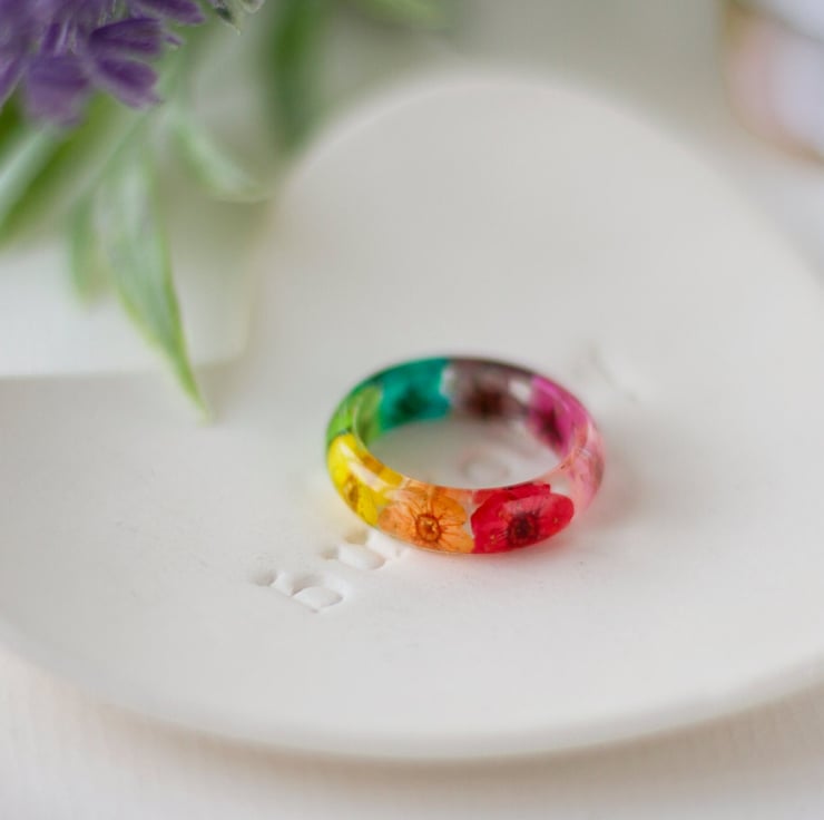 Real flowers in a rainbow of colours set in crystal clear resin - truly magical! They are about 5mm wide, so they look wonderful on their own, or as chunky stacking rings. Wear this ring and literally have summer in the palm of your hand...