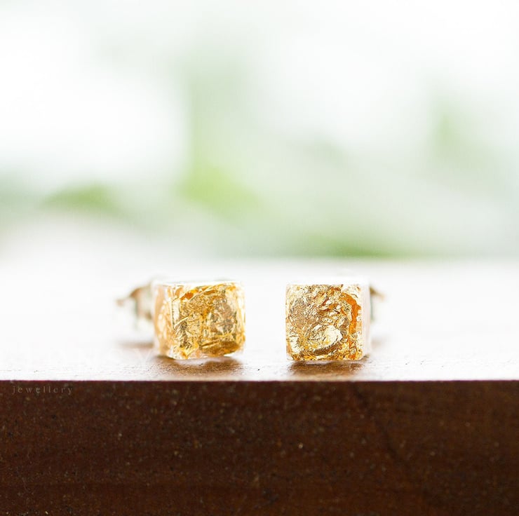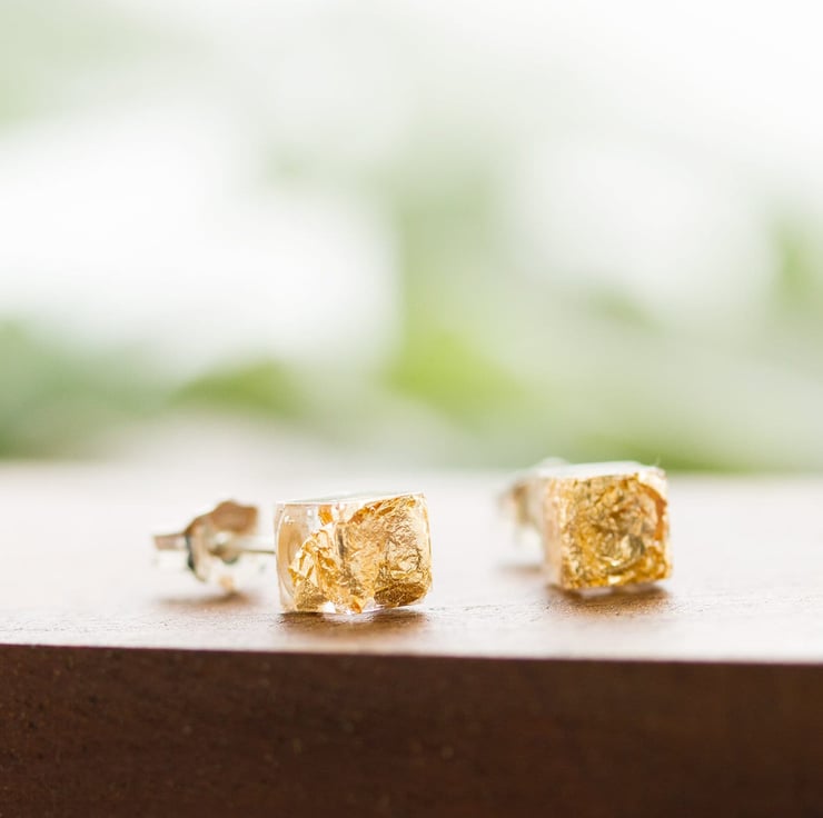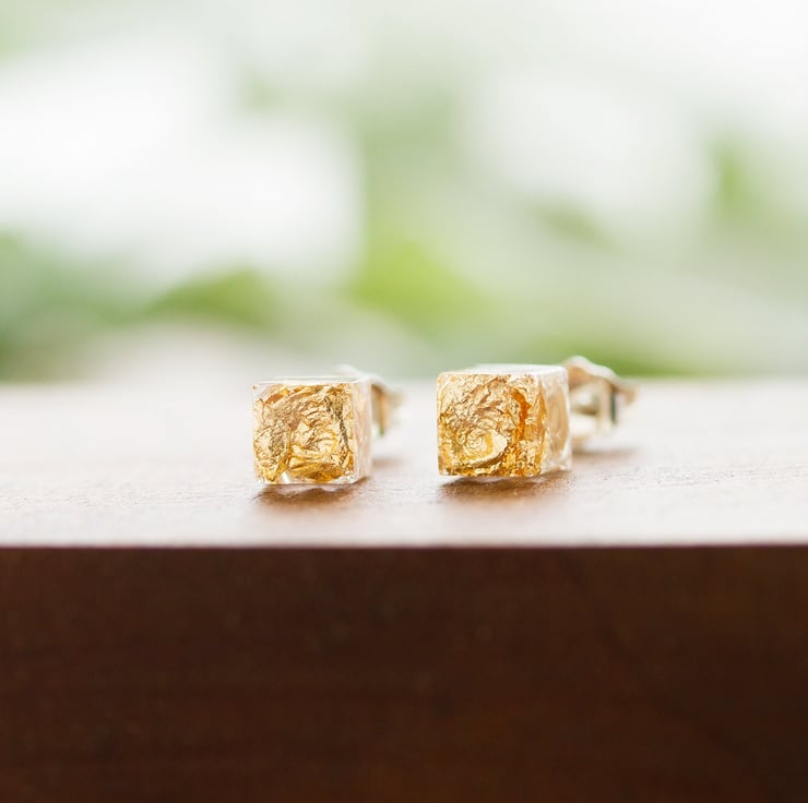 These beautiful earrings are perfect tiny cubes, filled with real gold leaf... they are stunning, and you can lose time just looking inside of them, seeing how the precious metal flakes catch the light.