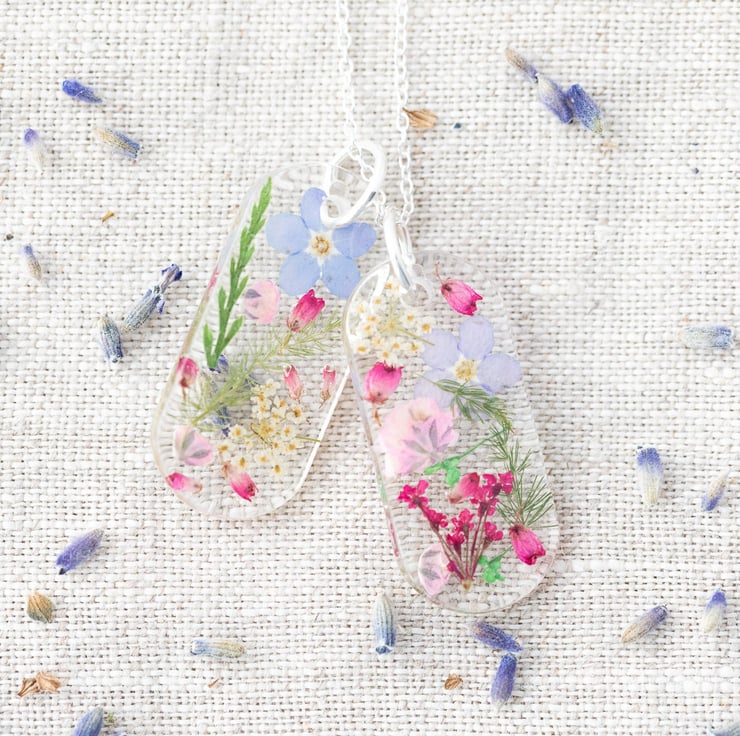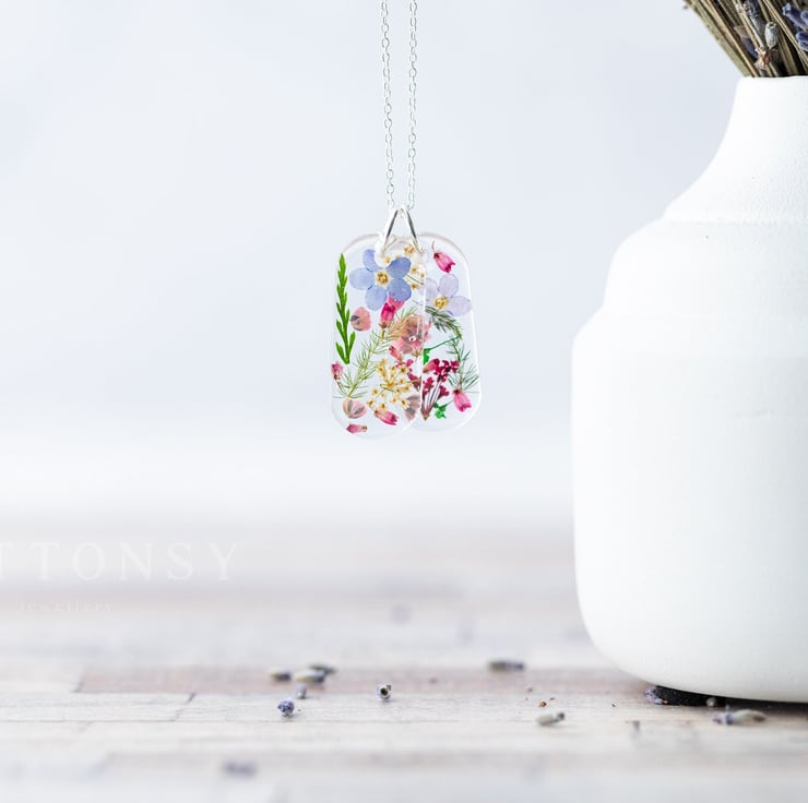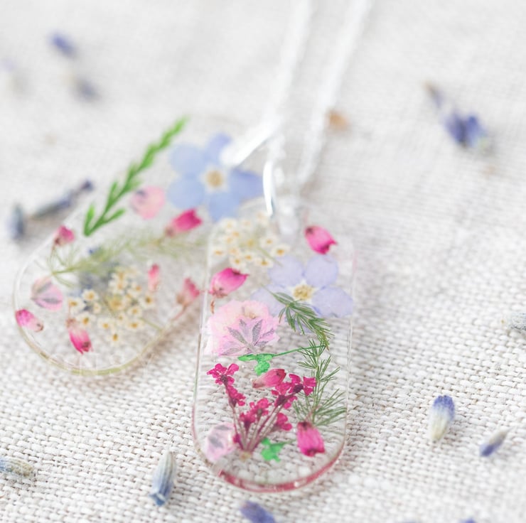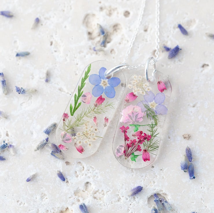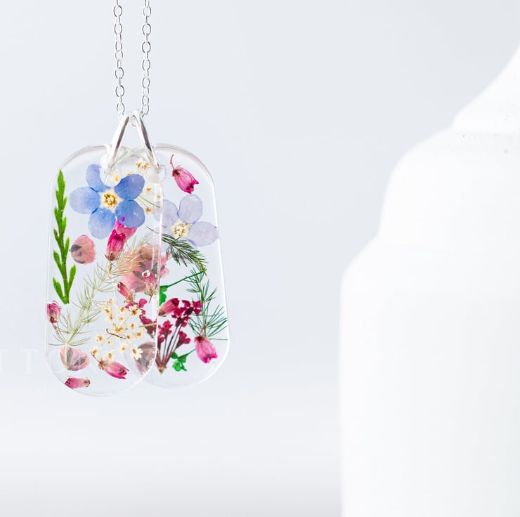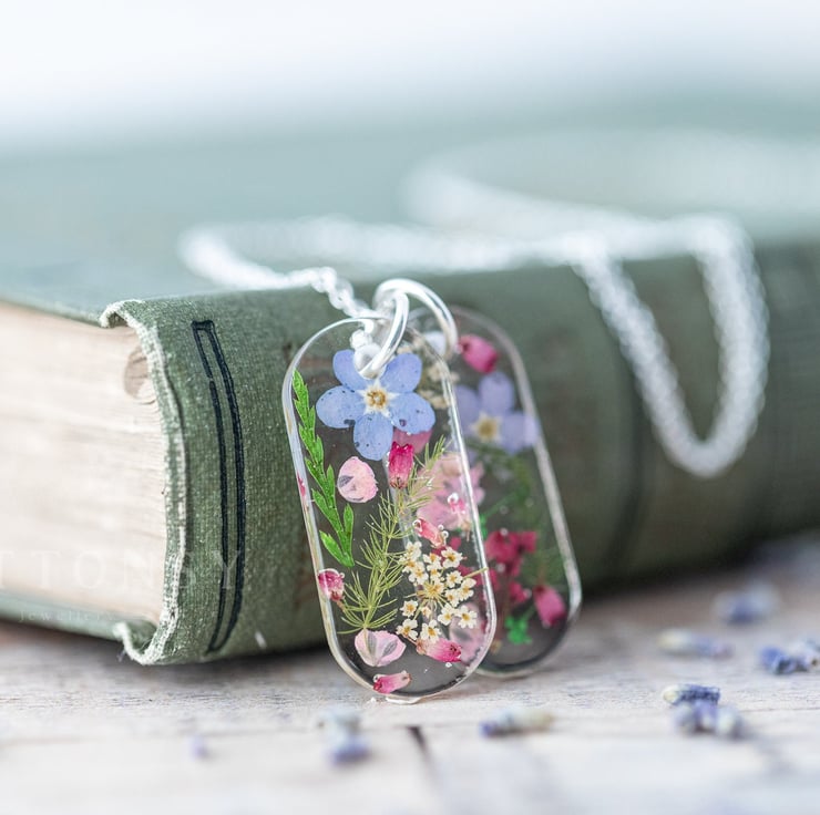 This beautiful piece of jewellery features forget me nots, maidenhead fern, asparagus fern, heather, Queen Anne's Lace, and a myriad others. Each necklace will be slightly different, but yours will look very similar to the ones in the photos.