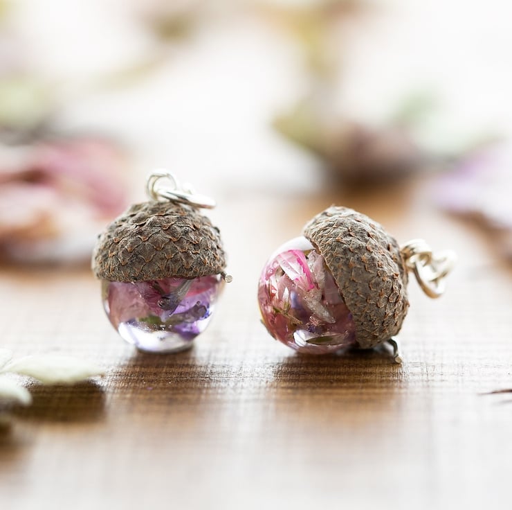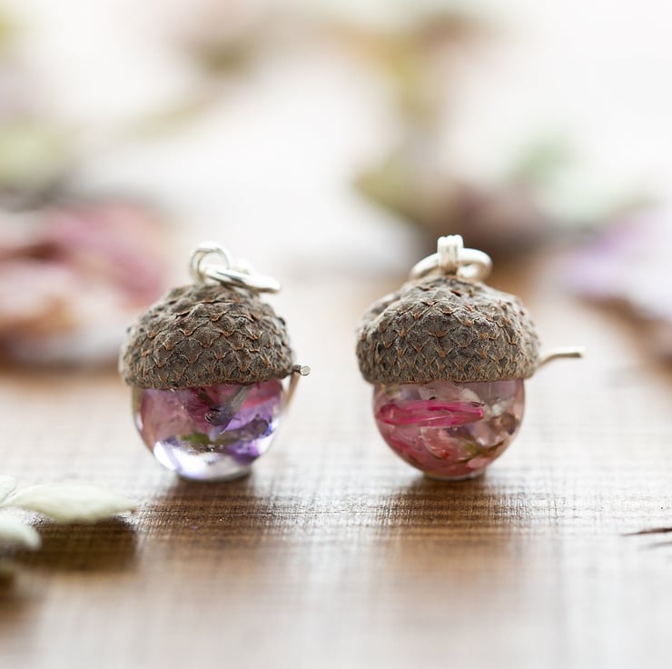 Each and every pair will be different, and we will use flowers that we have available, but if you want a specific colour included, please send us a message. The acorns are topped with real acorn caps.