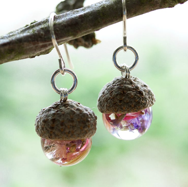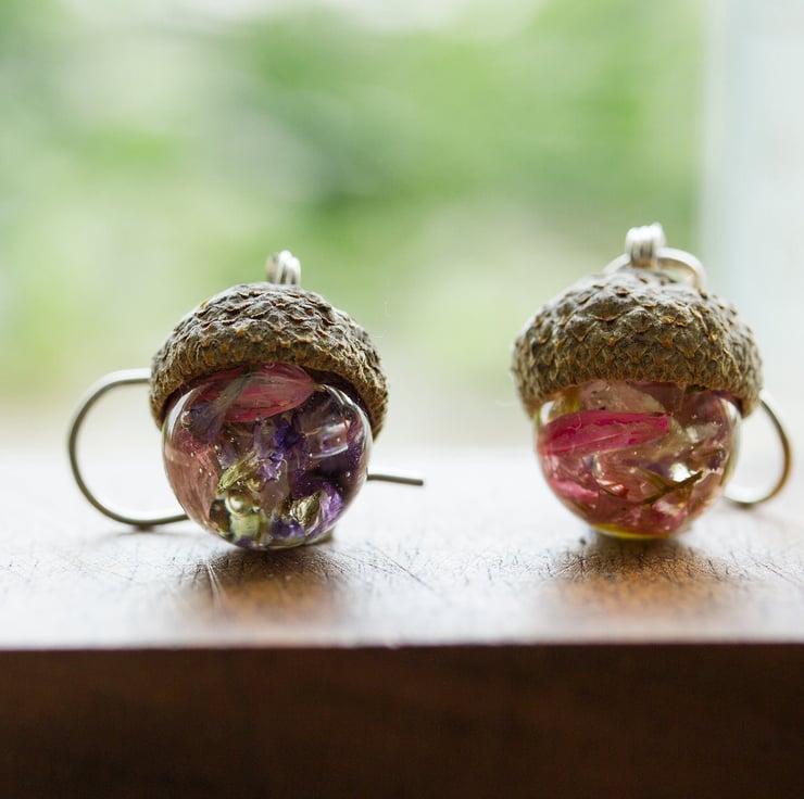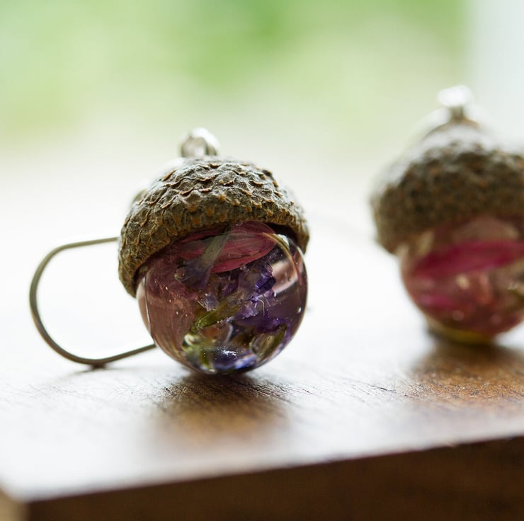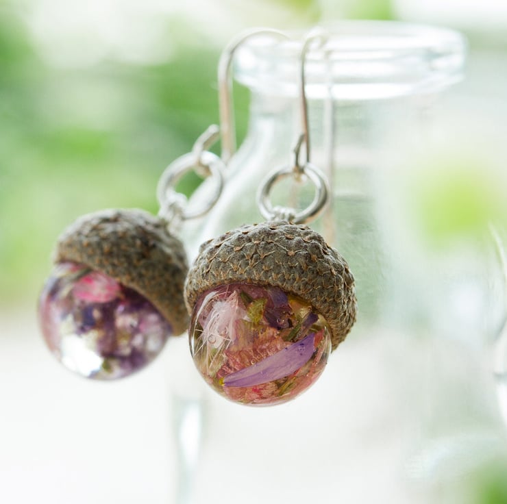 Tiny acorns, filled with real flowers... the very most magical Wendy's kiss. These earrings are full of childlike wonder - they are innocent and peaceful, and designed to make your heart smile.