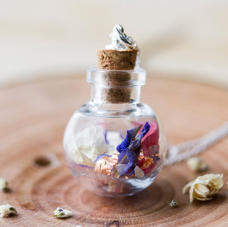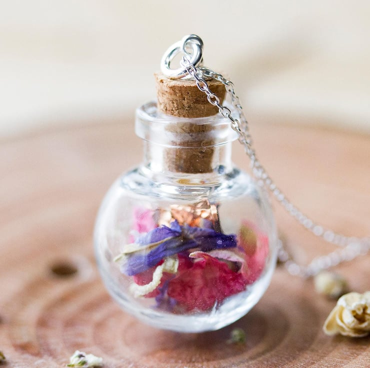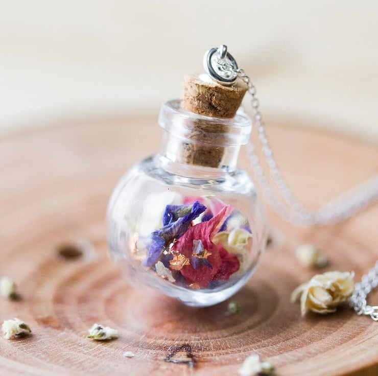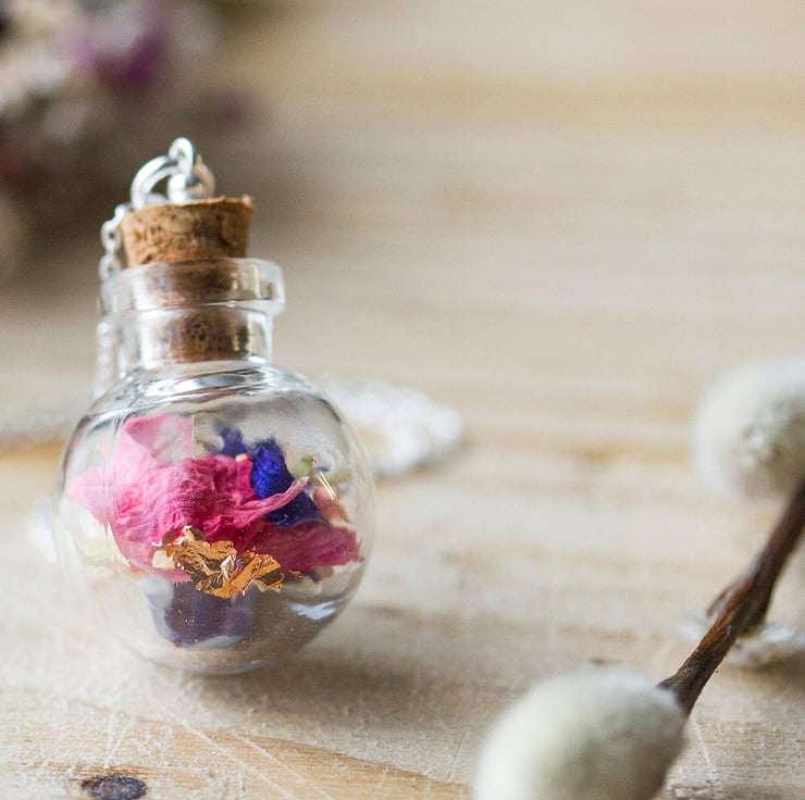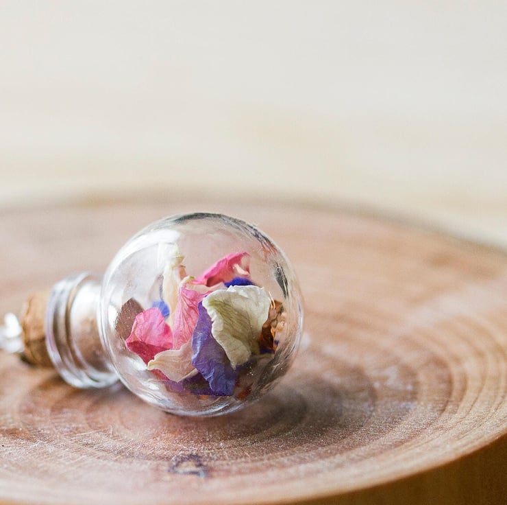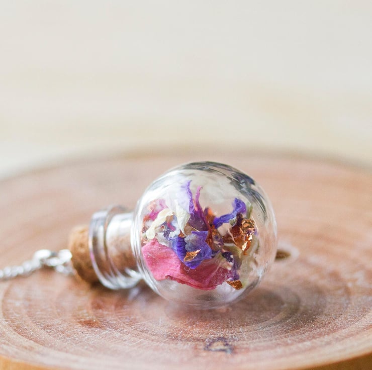 A glass globe, filled with dried wildflower petals in pinks, lilacs, purples, whites and blues. This is beautifully gentle, delicate jewellery - it carries summer and simple joy.