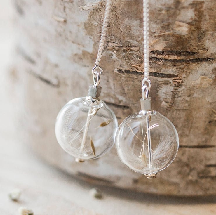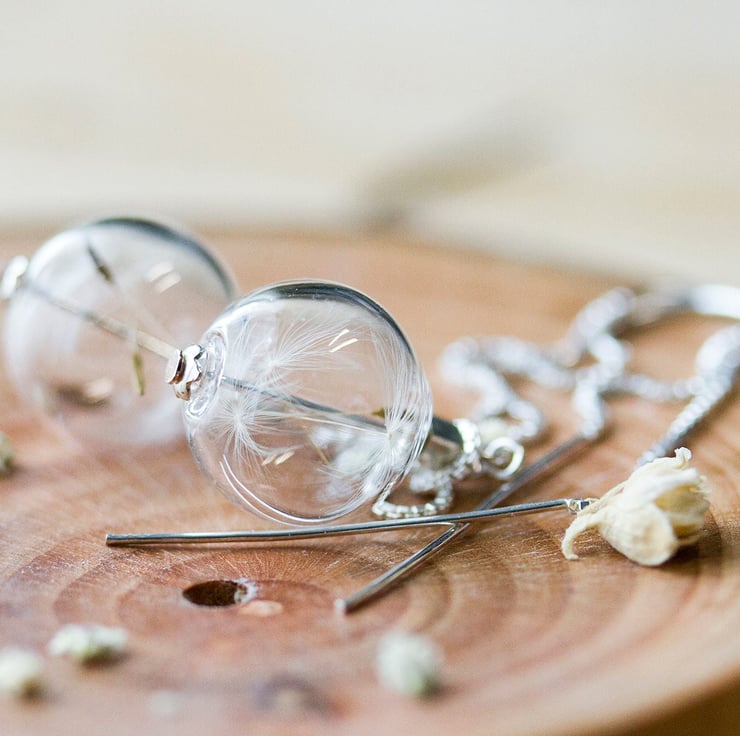 12mm glass globes filled with real dandelion wishes hang from 5" sterling silver threader earrings.