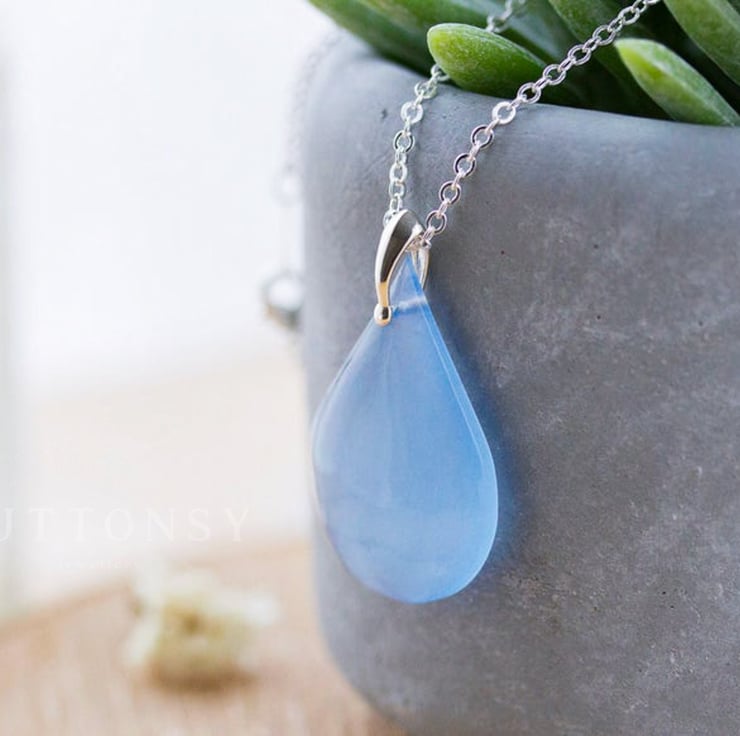 This gorgeous necklace is one perfect blue droplet of "water". It is perfectly semi-translucent so the light shines through it, but against your skin it is a beautiful, postcard-perfect water-blue. This is gentle, peaceful jewellery, for gentle, peaceful souls.