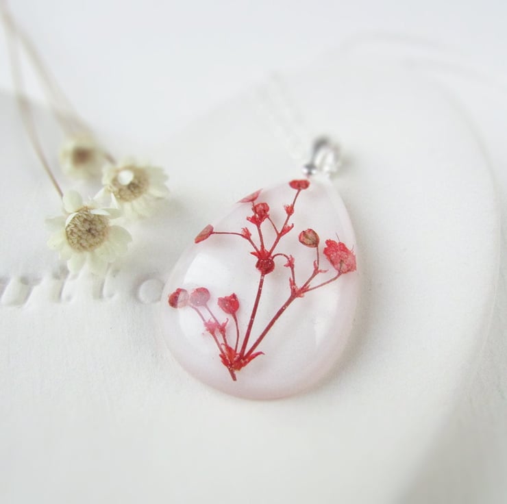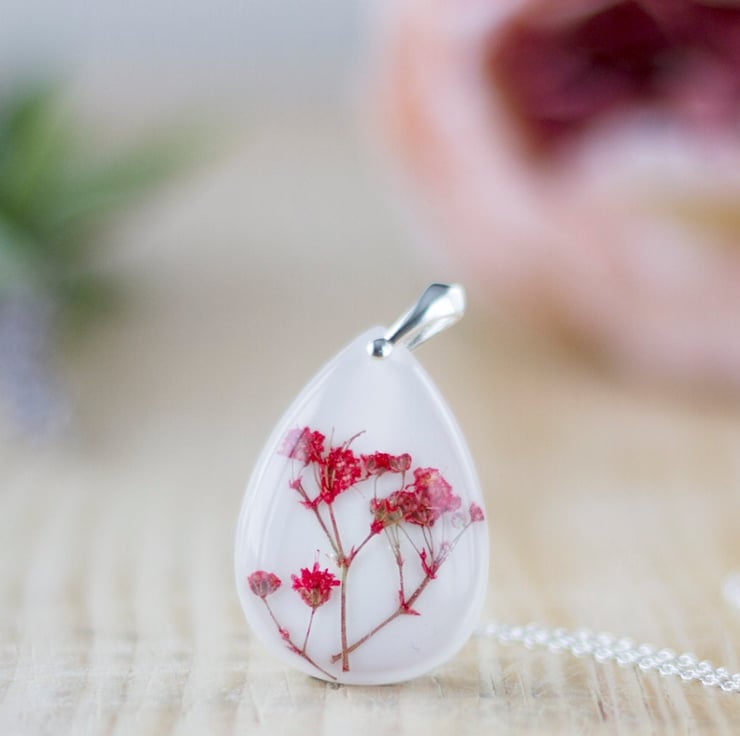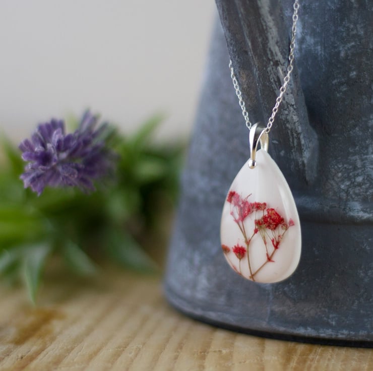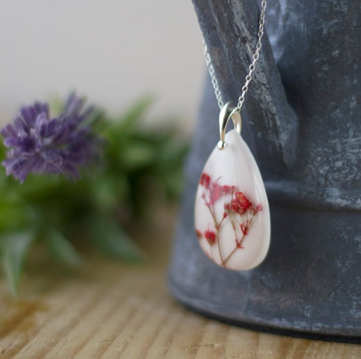 The flowers are set in UV stable crystal clear resin, and the pendant is 30mm from top to bottom, not including the bail, and comes on an 18" sterling silver chain.