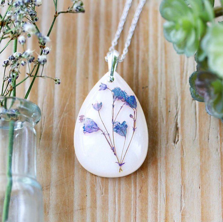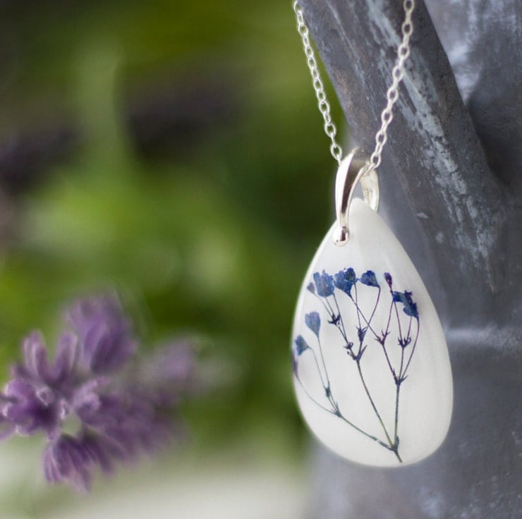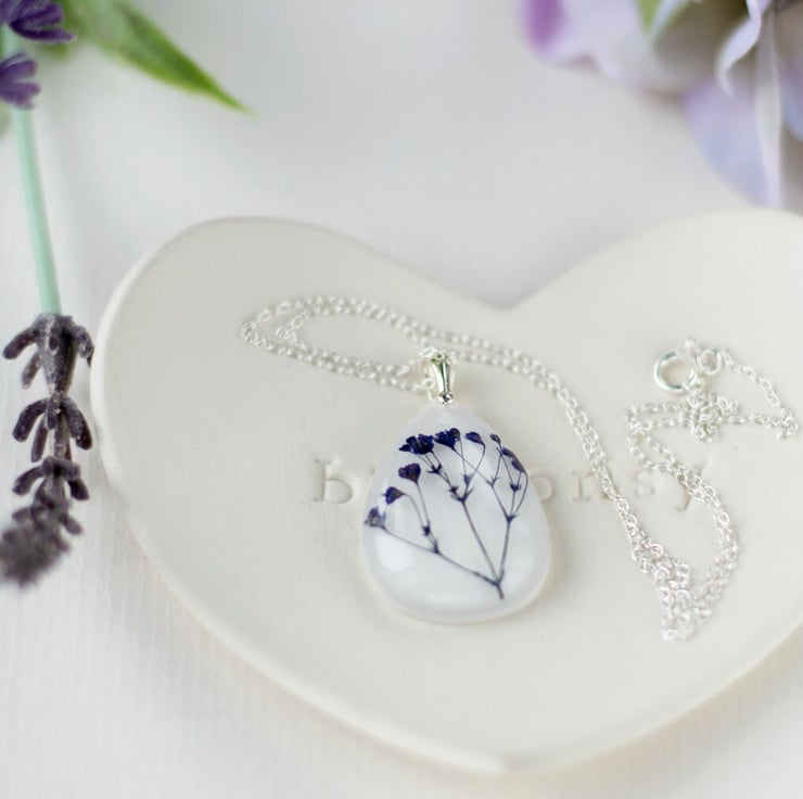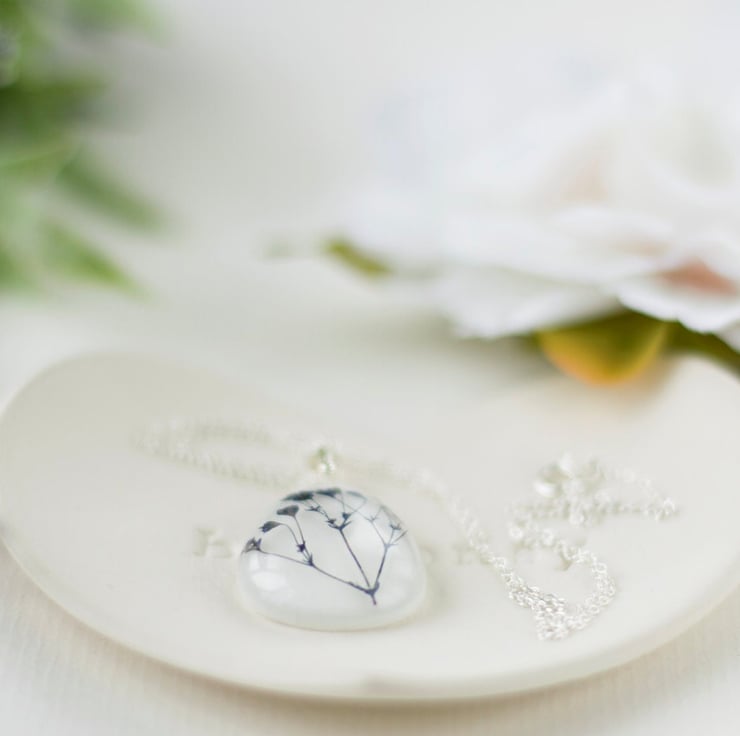 A sprig of real Gypsophila - also known as "Baby Breath" - on a pure white background... Baby Breath is one of the most delicately beautiful flowers. Gypsophila flowers are tiny, and so very pretty. They're known for being used in wedding bouquets in pure white; we hand dye a lot of ours to make beautifully bright, gentle jewellery.