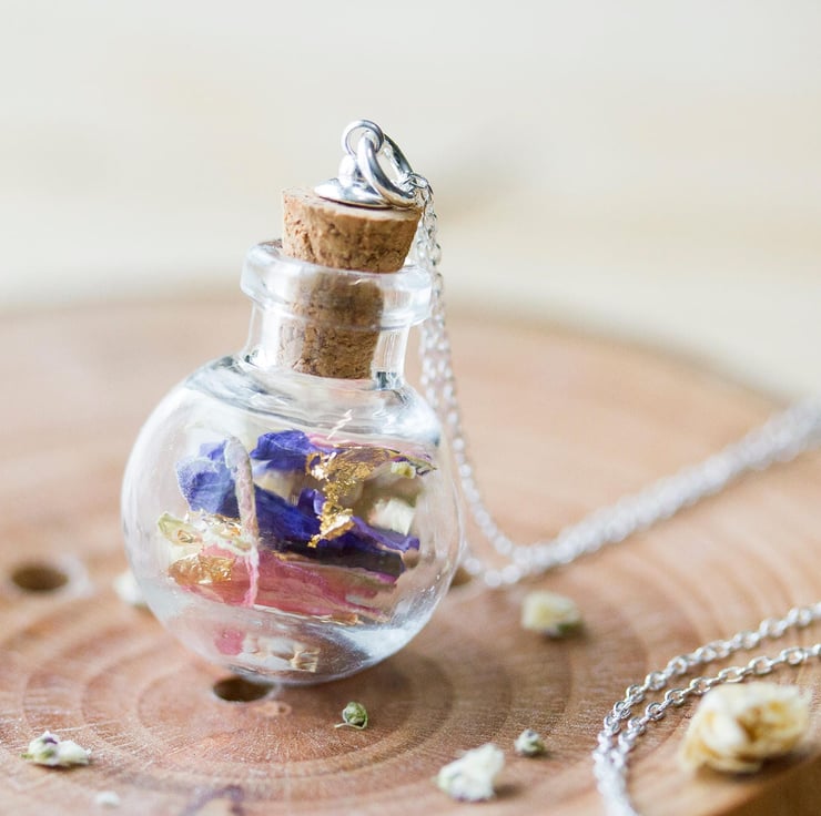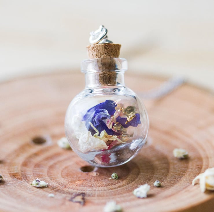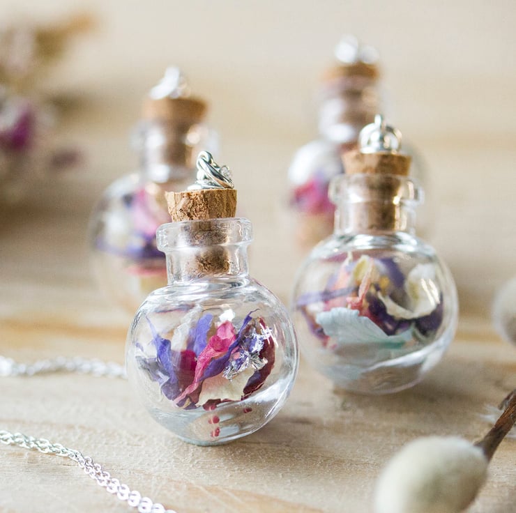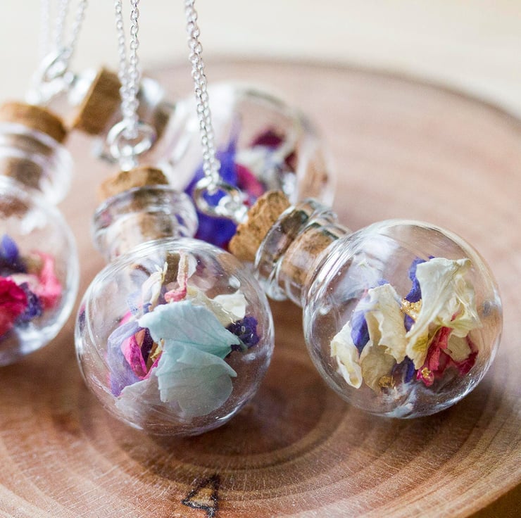 A glass globe, filled with dried wildflower petals in pinks, lilacs, purples, whites and blues. This is beautifully gentle, delicate jewellery - it carries summer and simple joy.