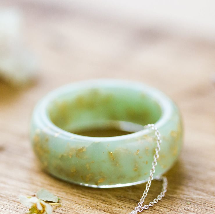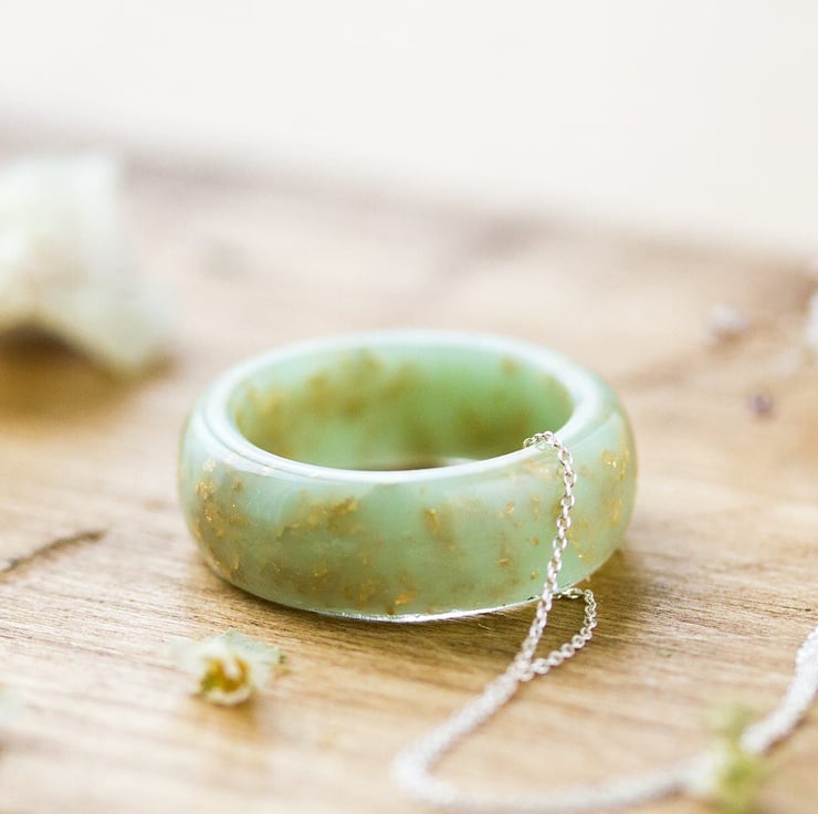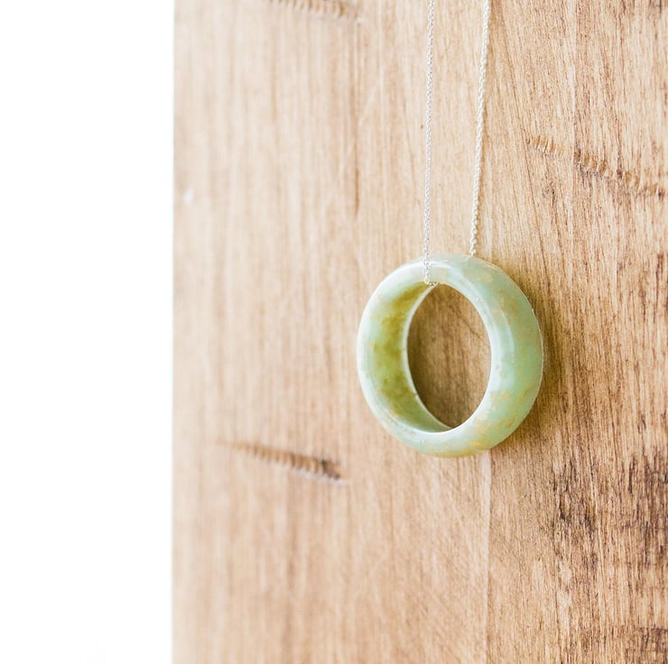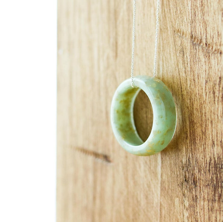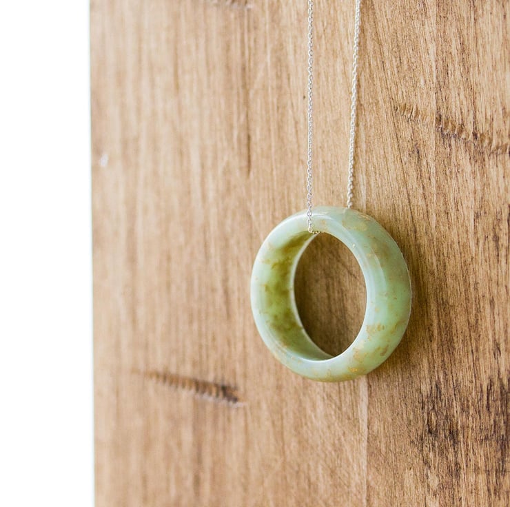 A gorgeous, avocado-green, chunky "ring" with gold flakes hanging freely from its chain... this is a peaceful, gentle, contemporary necklace for peaceful, gentle souls.