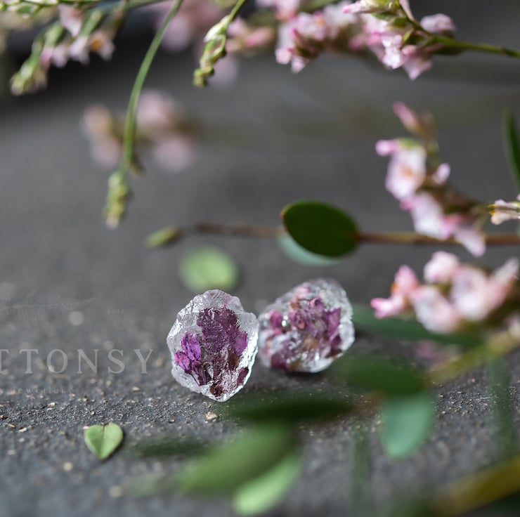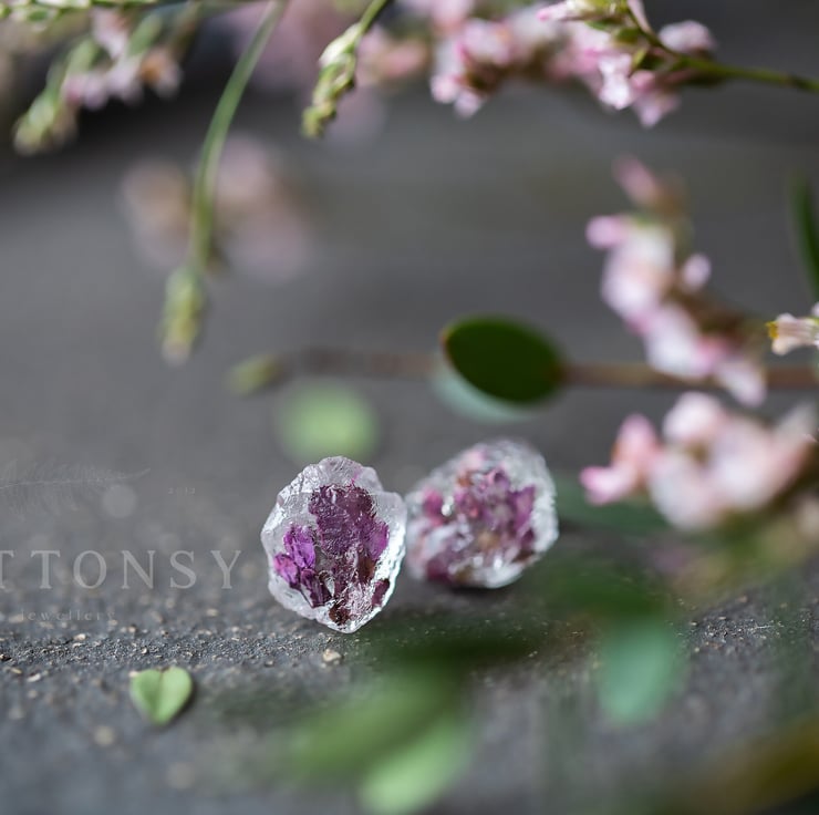 The flowers are set in jewellery grade crystal clear resin, then polished to a high shine. Each pair is completely handmade, so each pair will be slightly different, but each stud is between 8mm and 10mm.