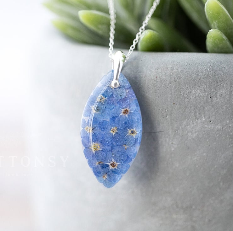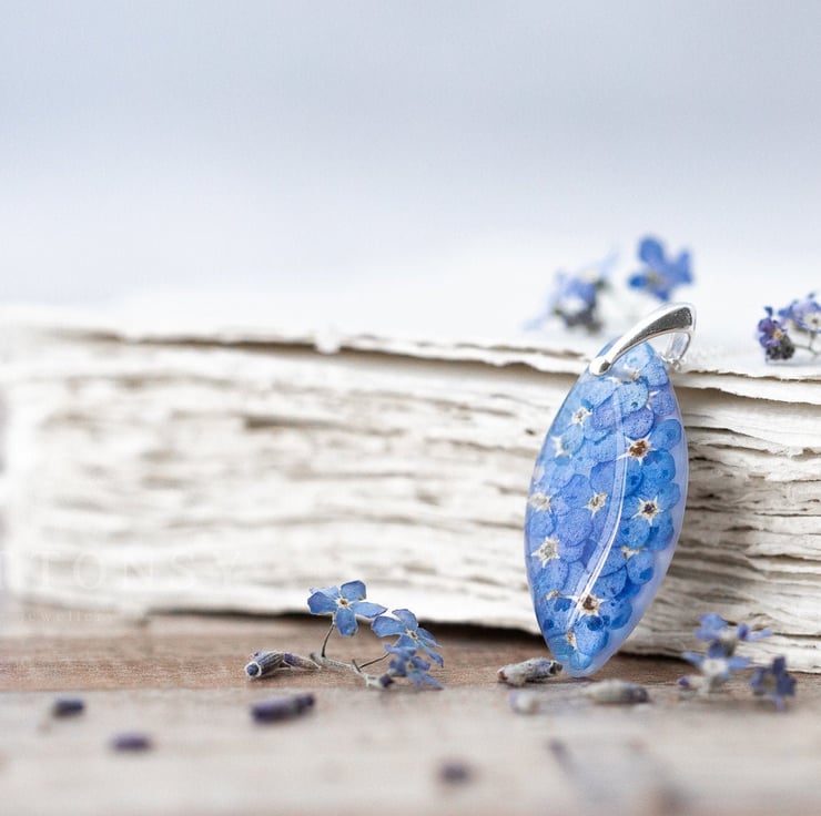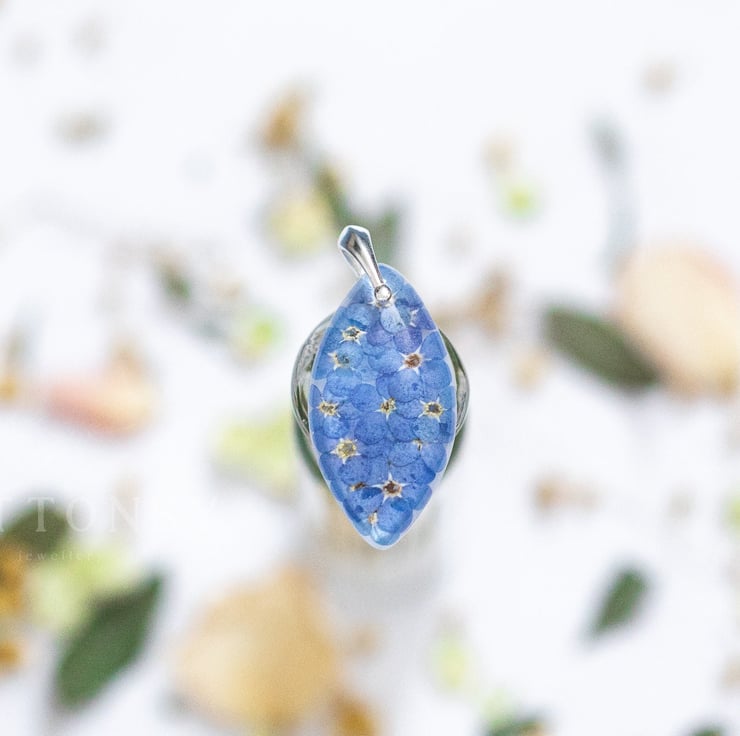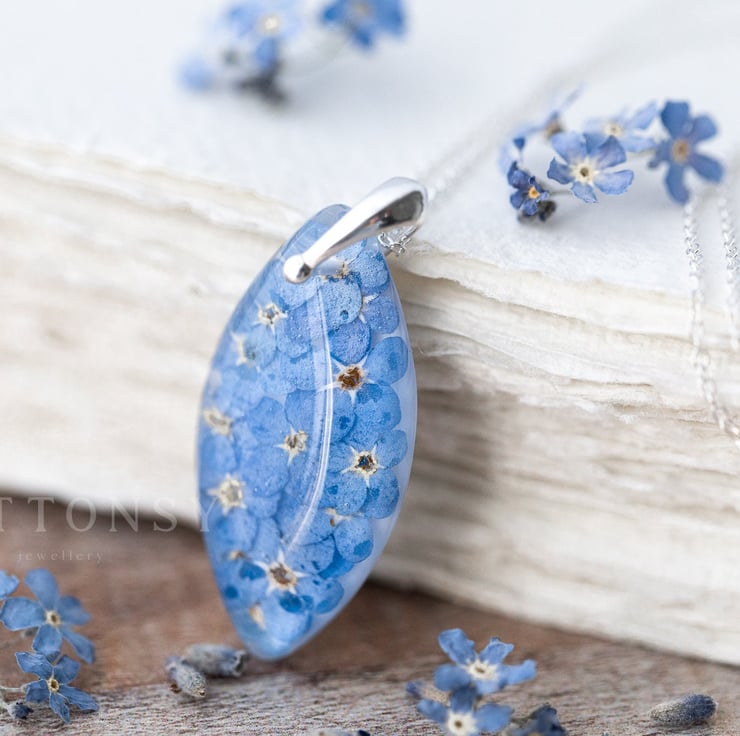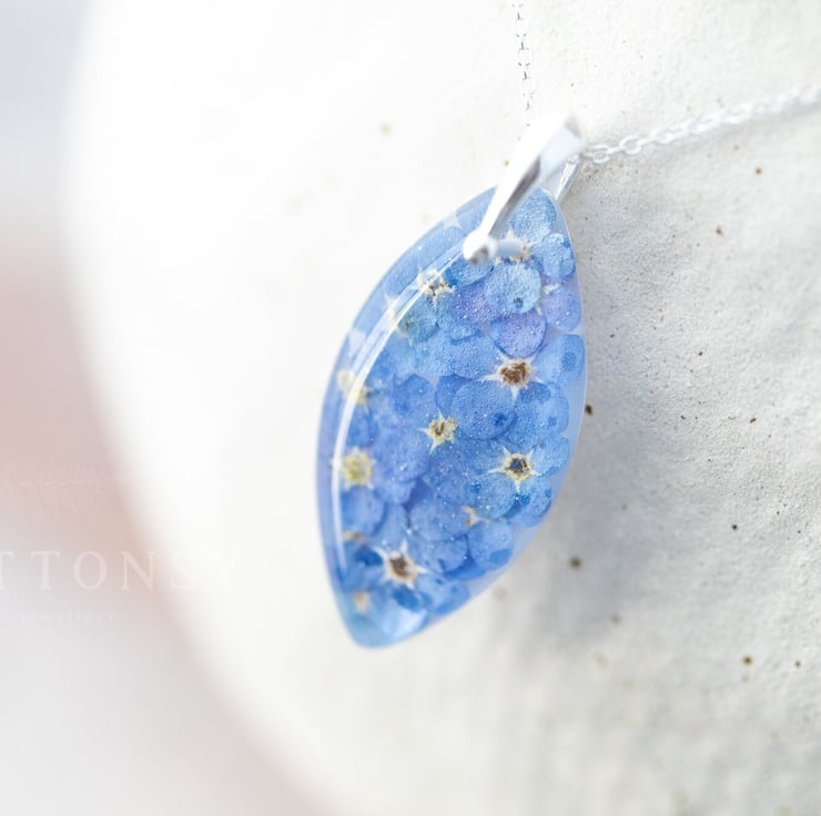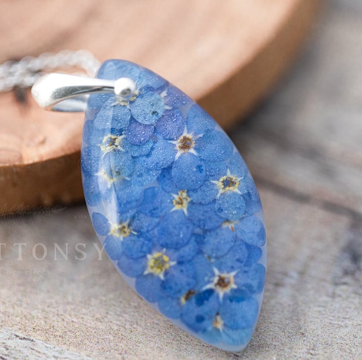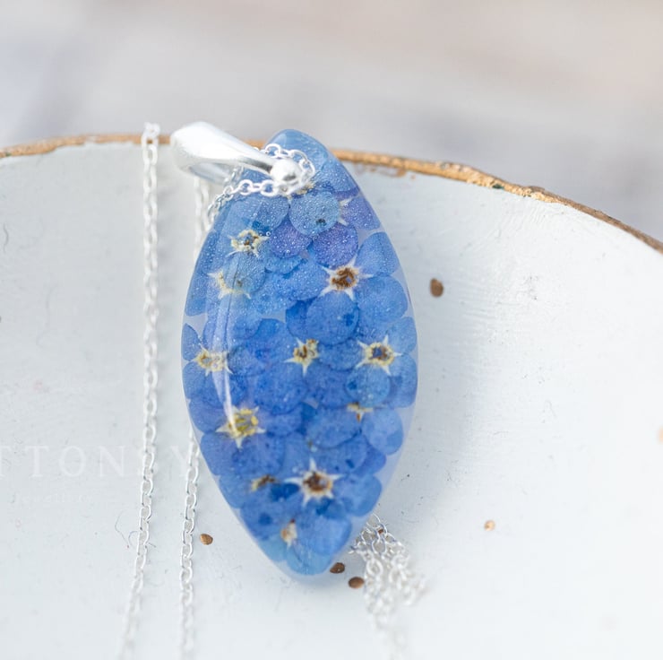 The ellipse is 35mm long, and absolutely filled to the brim with perfect, perfect forget me nots and it comes on a 18" sterling silver chain.