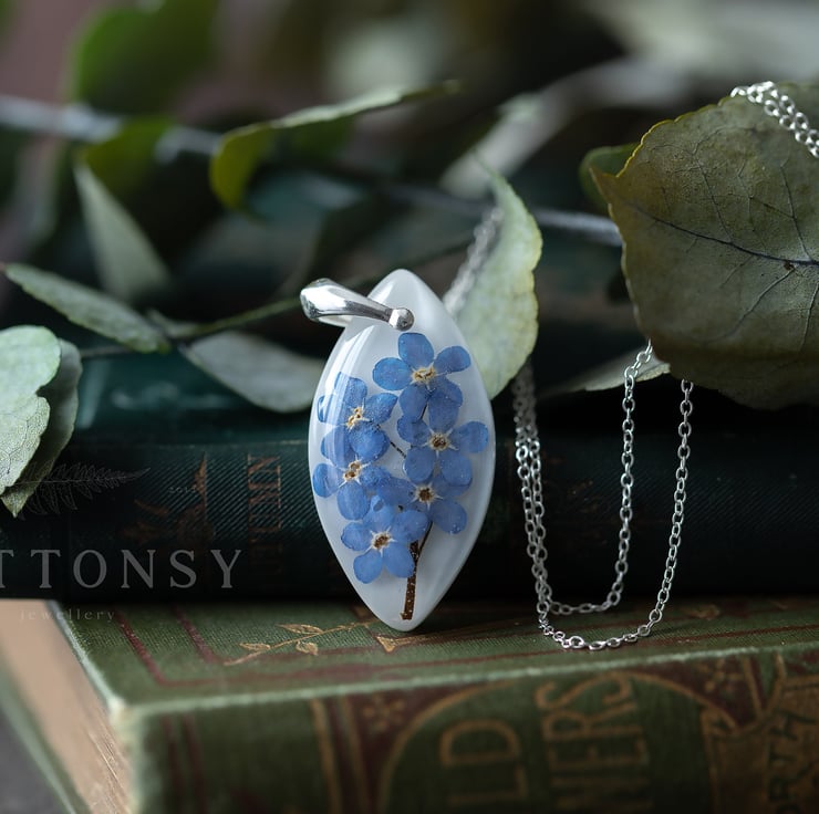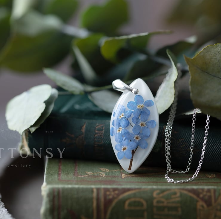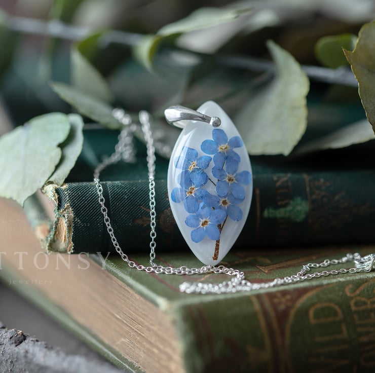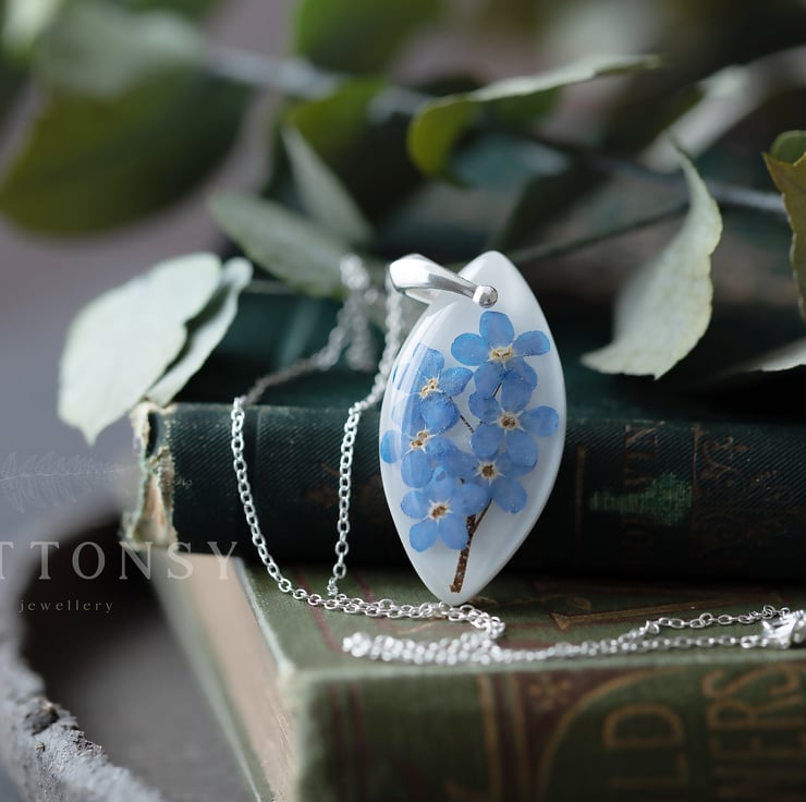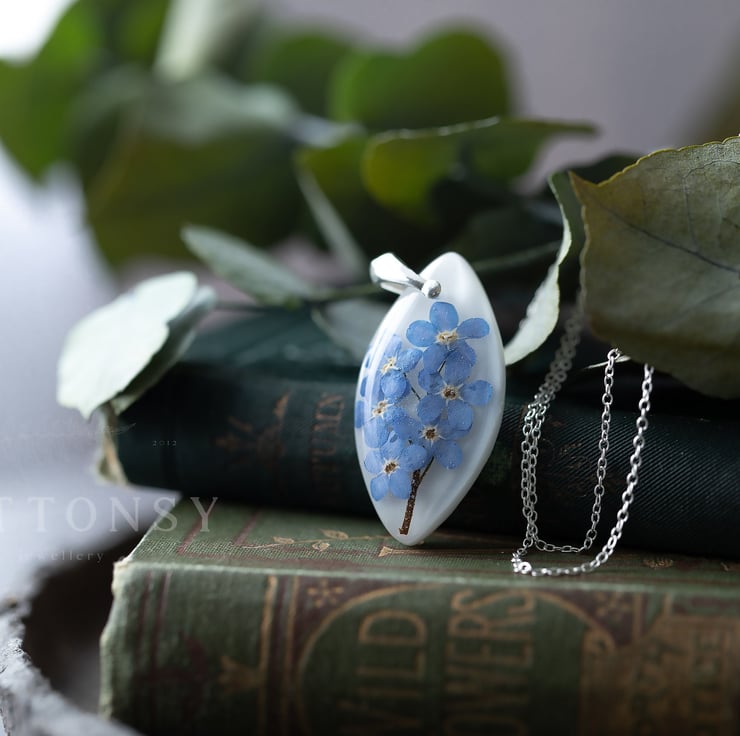The ellipse is 35mm long, and contains one perfect, perfect open-flowered sprig of forget me nots.