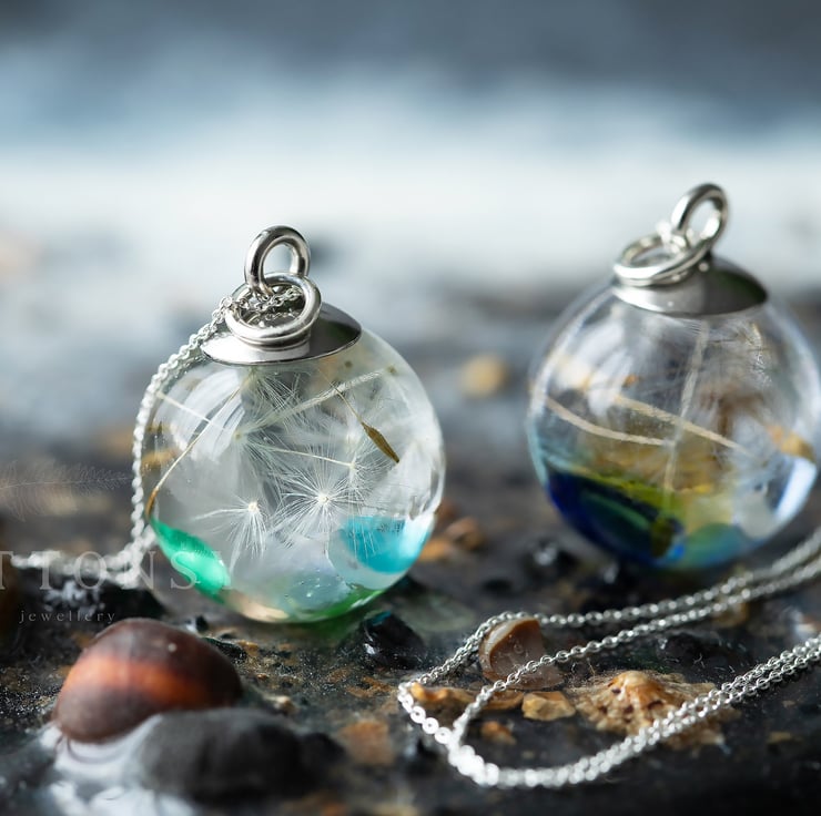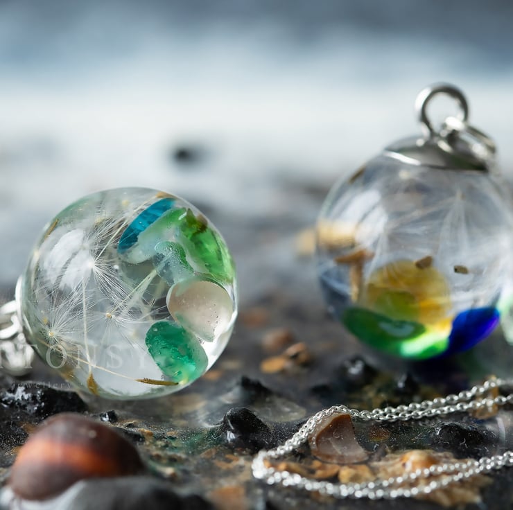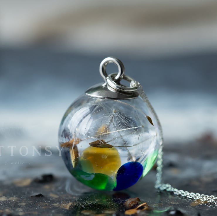 A globe of perfect, tiny pieces of multi-coloured sea glass... beautiful, beautiful shades of green, aqua, teal, cobalt, orange and, if you're very lucky, crimson; they've been paired with the very fluffiest of fluffy dandelions - it captures the joy of blowing a dandelion as you stand on a beach, watching the waves roll in and pull the shingle pebbles back out to sea.