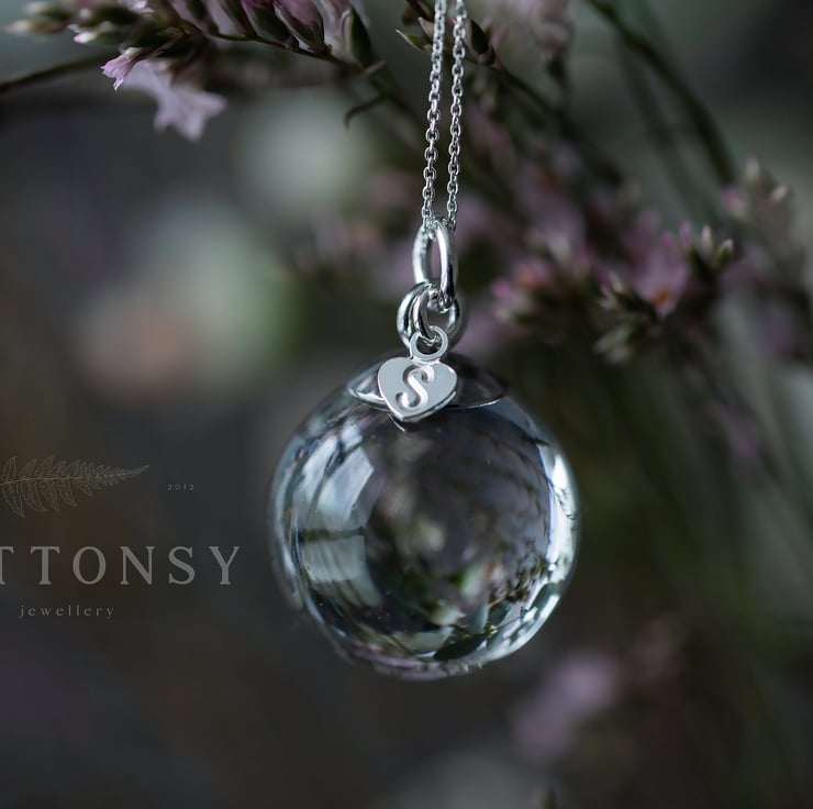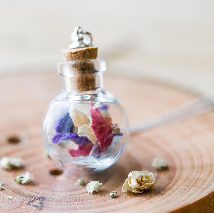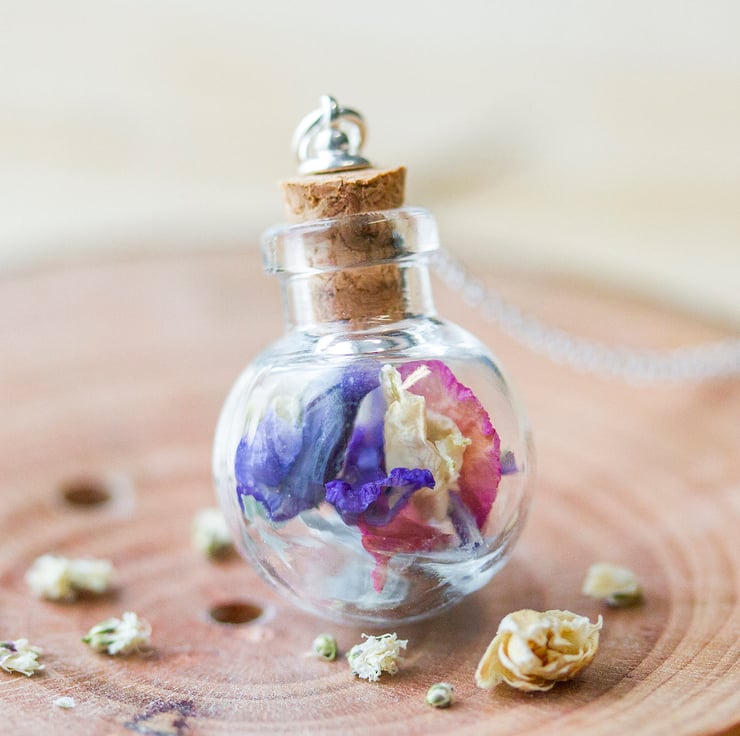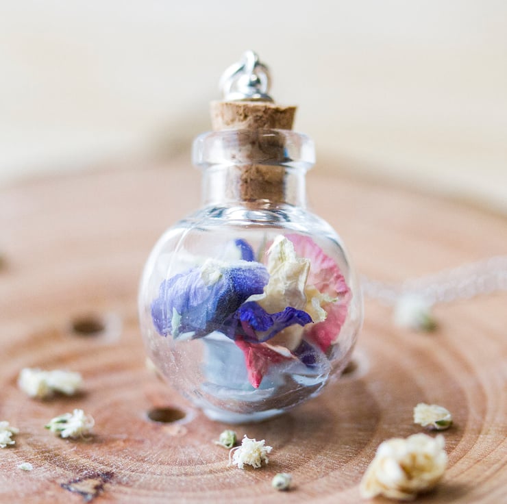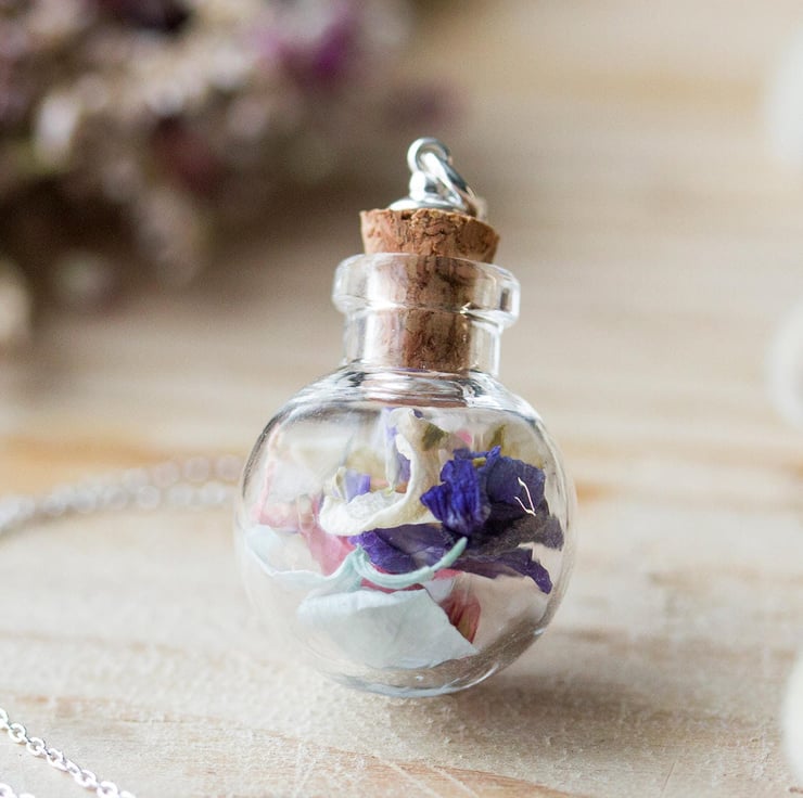 A glass globe, filled with dried wildflower petals in pinks, lilacs, purples, whites and blues. This is beautifully gentle, delicate jewellery - it carries summer and simple joy.