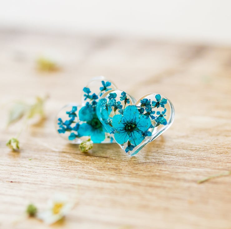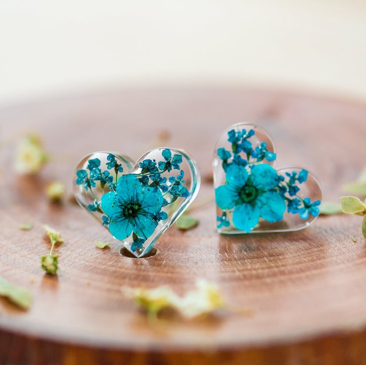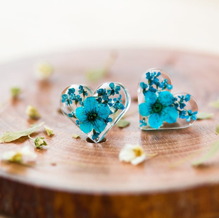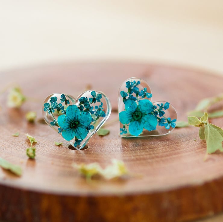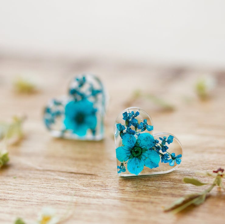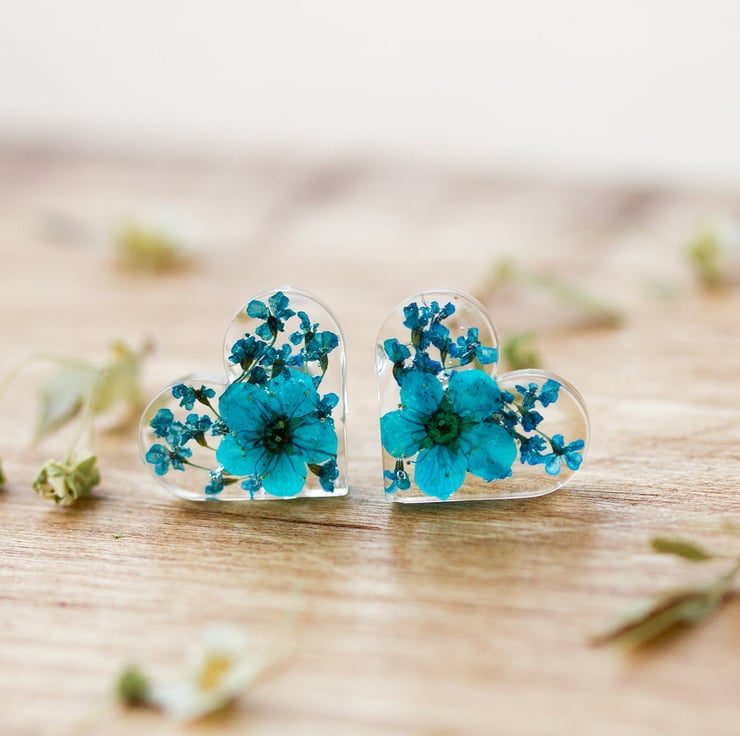 Real Flower Earrings Blue Hearts Sterling Silver Something Blue Resin Jewellery