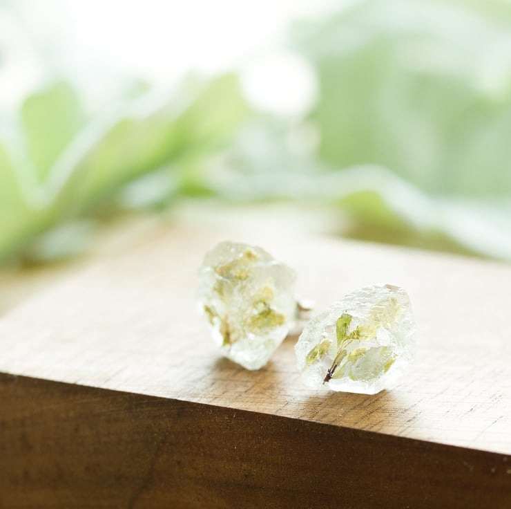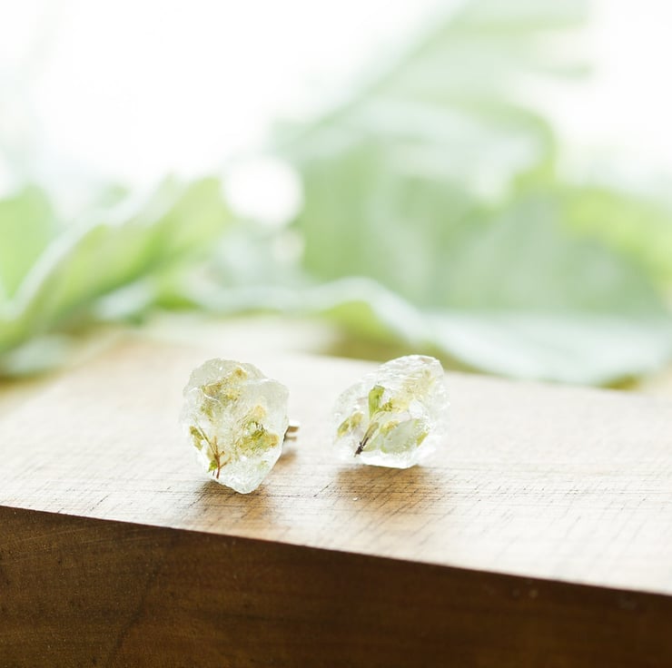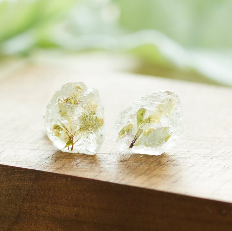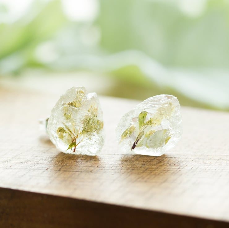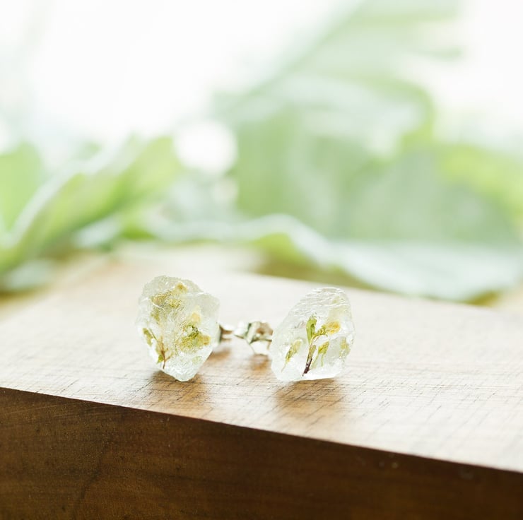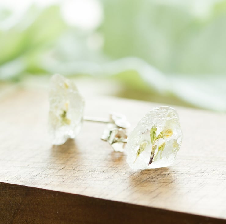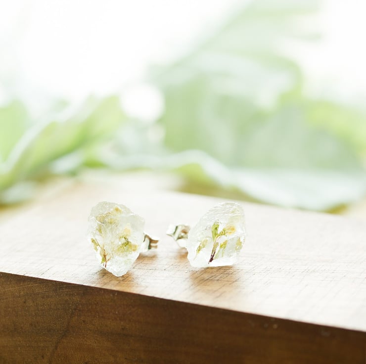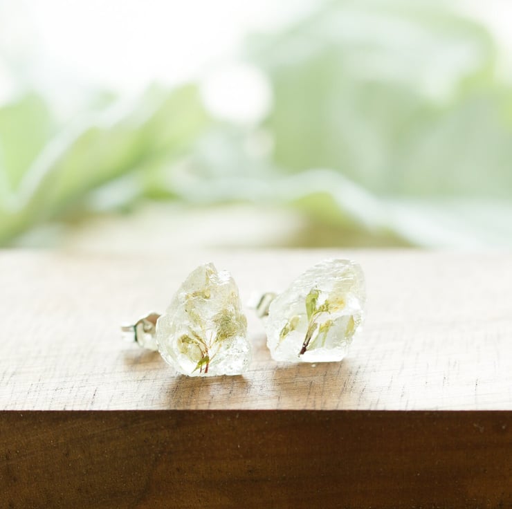 The flowers are set in jewellery grade crystal clear resin, then polished to a high shine. Each pair is completely handmade, so each pair will be slightly different, but each stud is between 8mm and 10mm.