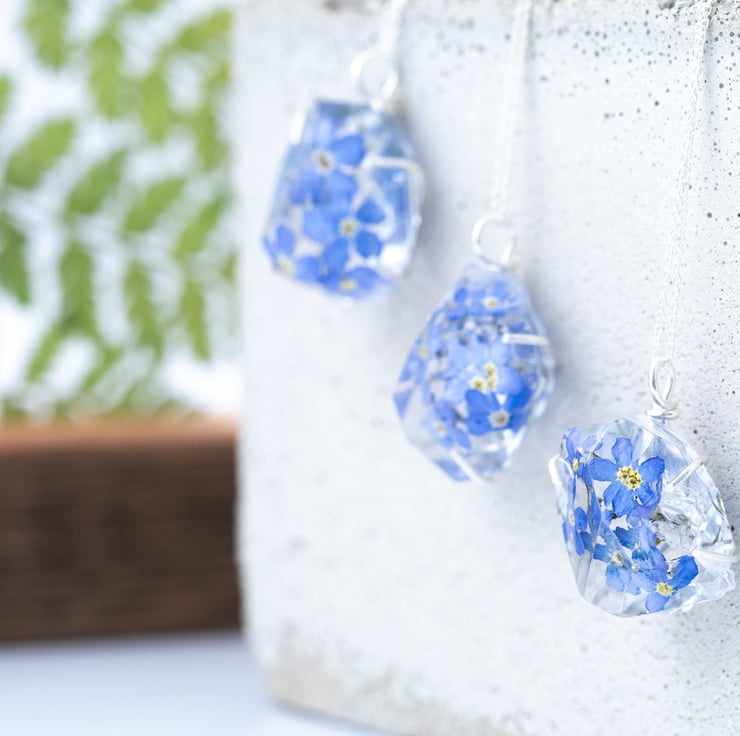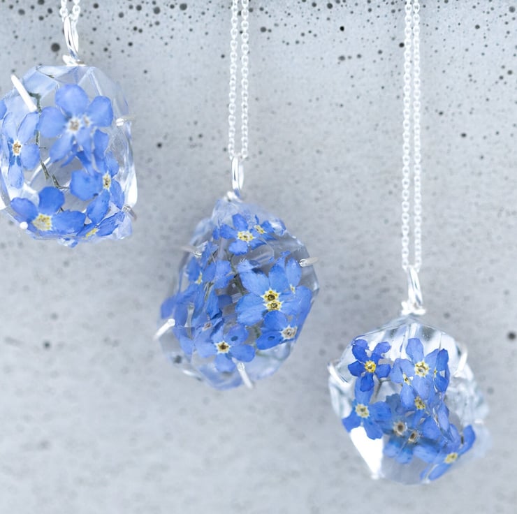 These perfect forget me nots have been placed in a "raw stone"; the shape was made from a gorgeous, gorgeous genuine Herkimer diamond - truly stunning. The "stone" is held in place with a handmade sterling silver claw grip setting, and comes on an 18" sterling silver chain.