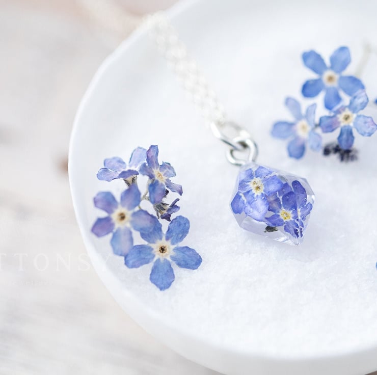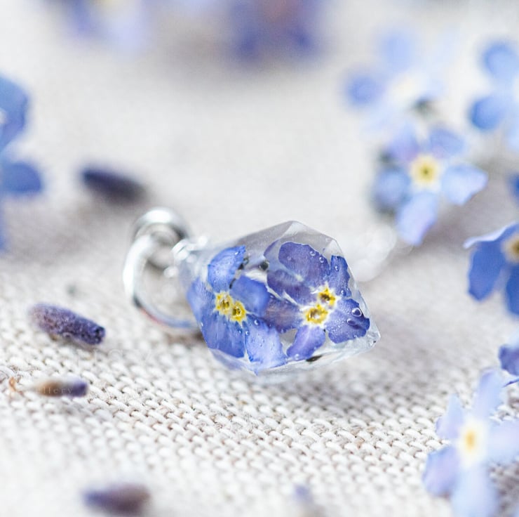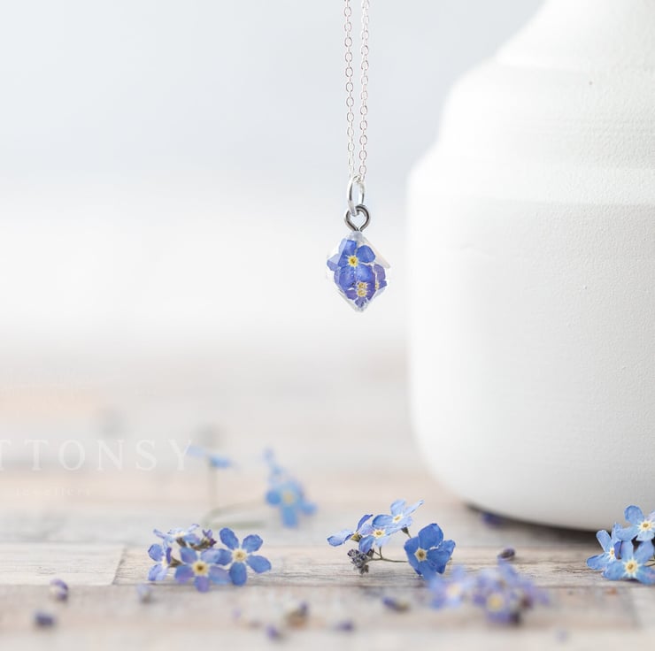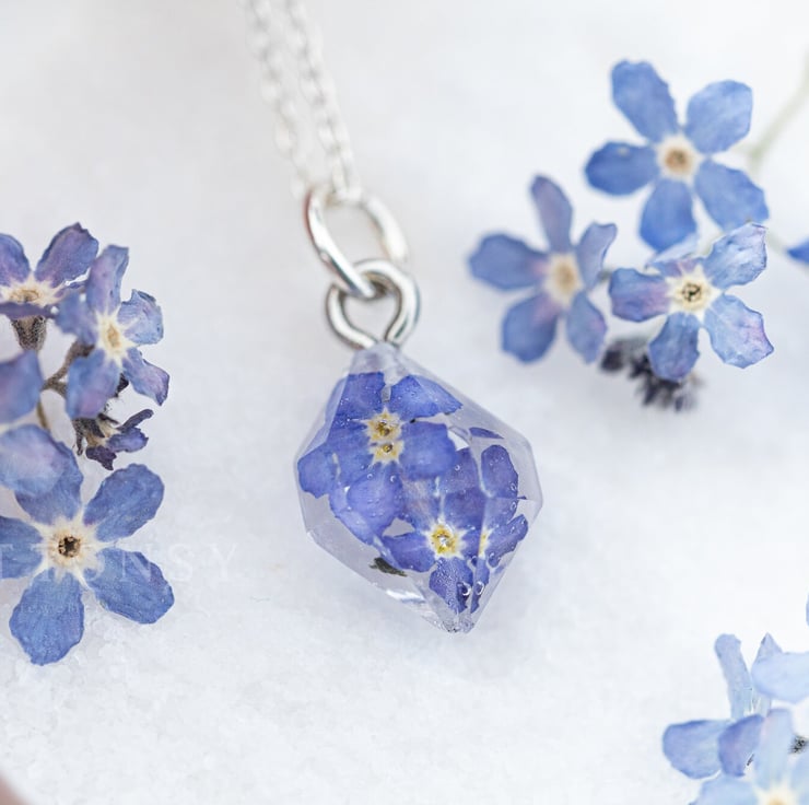 Tiny Forget Me Not Necklace "Raw Crystal" Pressed Flower Jewelry Gifts For Her S
