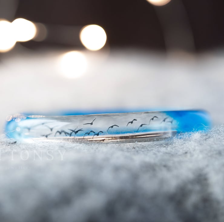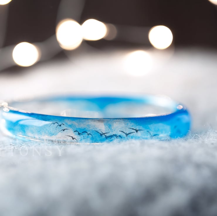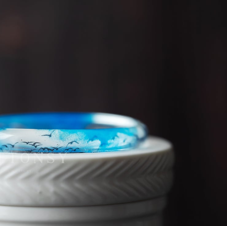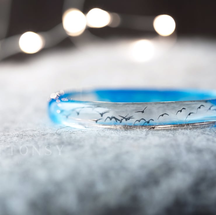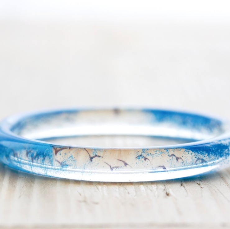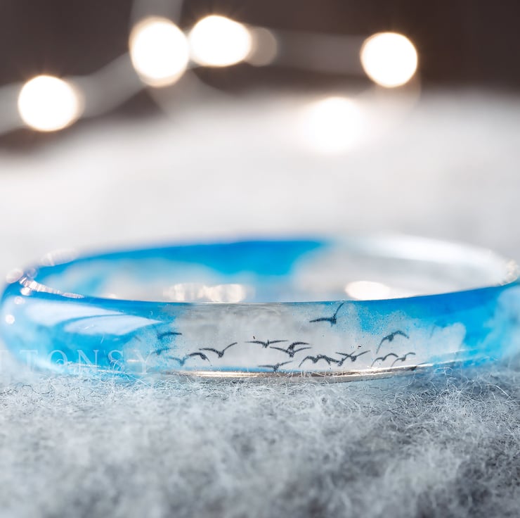 A murmuration of birds is swooping around the blue, blue sky in this beautiful skinny bangle. Each and every bangle is handmade and so each and every one is slightly different... they each have their own personalities to match the birds flying free inside. It is a thin round stacking bangle, just 8mm wide, with a large opening of 70mm across.