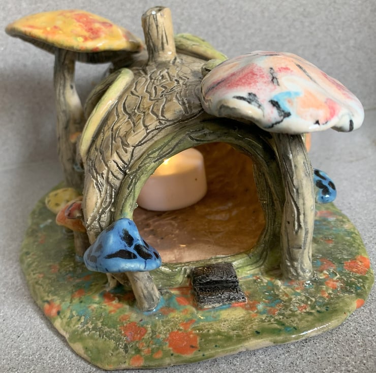 A fairy house surrounded by colourful mushrooms. I used some multi coloured glazes on the piece so there are lots of colours to be seen. Can hold a tea light, incense cone or battery operated candlelight. It also has a functioning chimney! Made from stoneware so suitable for indoor or outdoor use. The house is approx 7.5 ins (19cms) long and 4ins (10cms) wide.