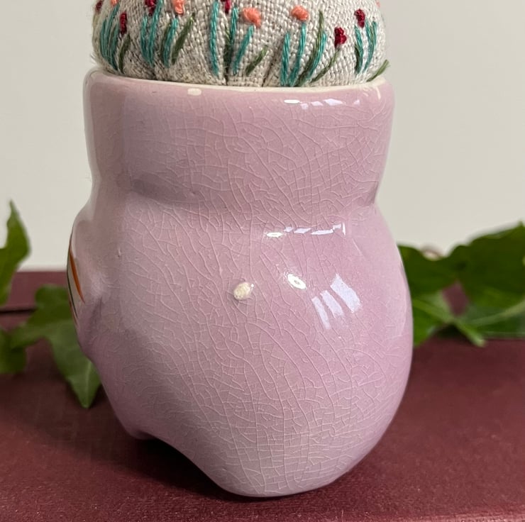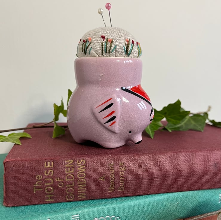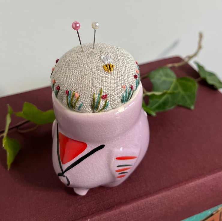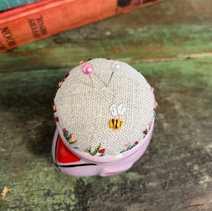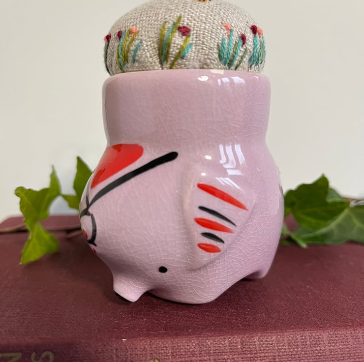 Cute embroidered pincushion in a vintage egg cup in the shape of pink circus elephant. The reclaimed linen cushion has been embroidered with tiny flowers and a bee.
