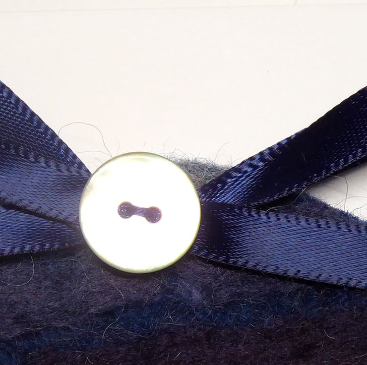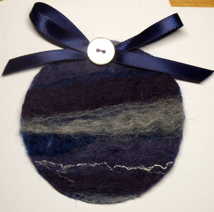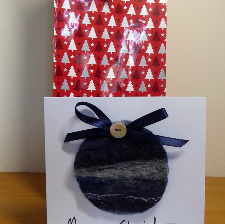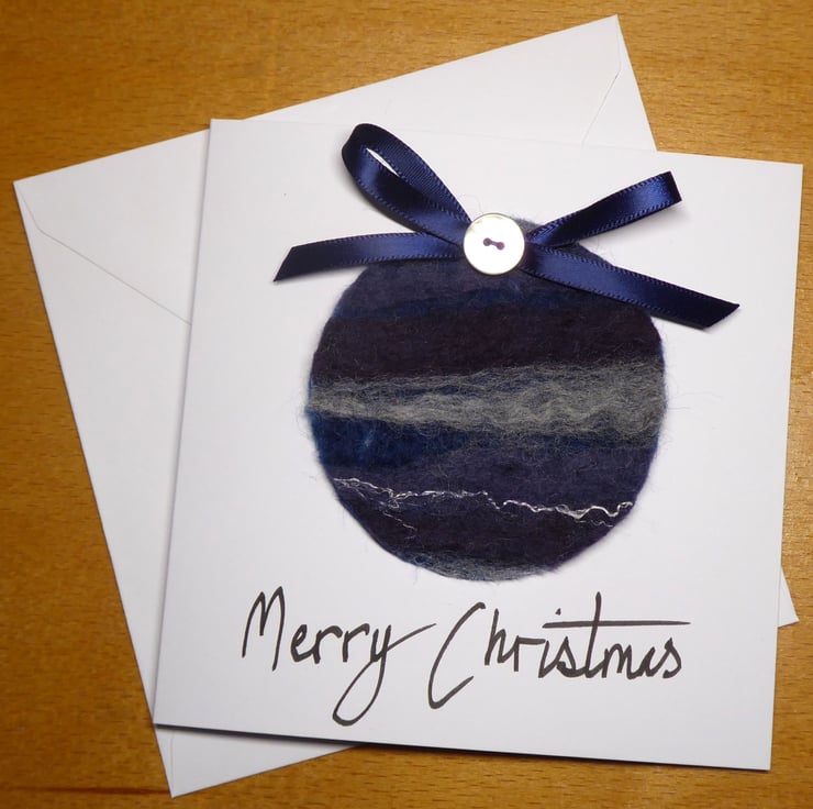 A simple Christmas card design depicting a decorative bauble. The bauble is made by wet felting an attractive combination of colourful Merino wool and attaching a hand tied ribbon-bow and button. A calligraphic Merry Christmas is penned in black ink on the front.