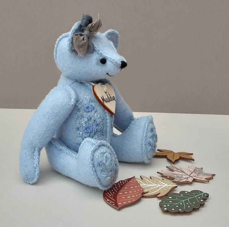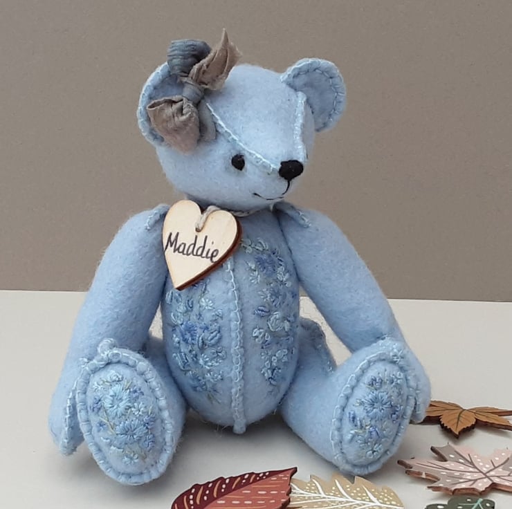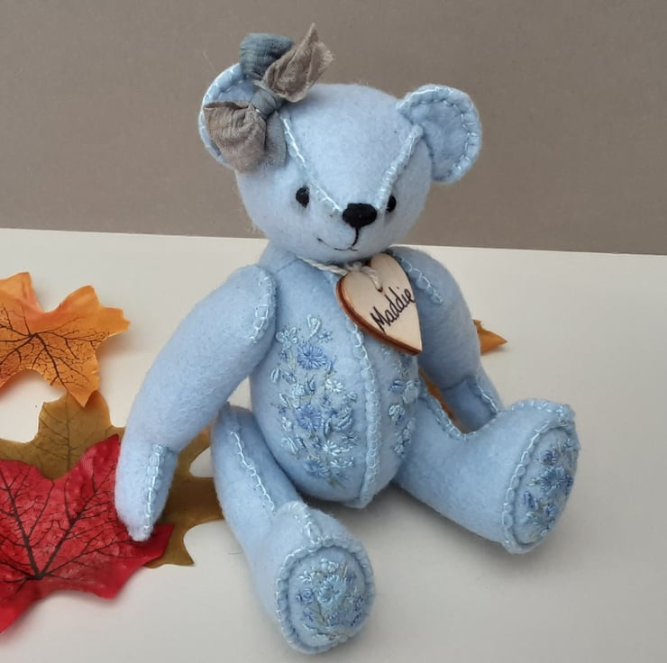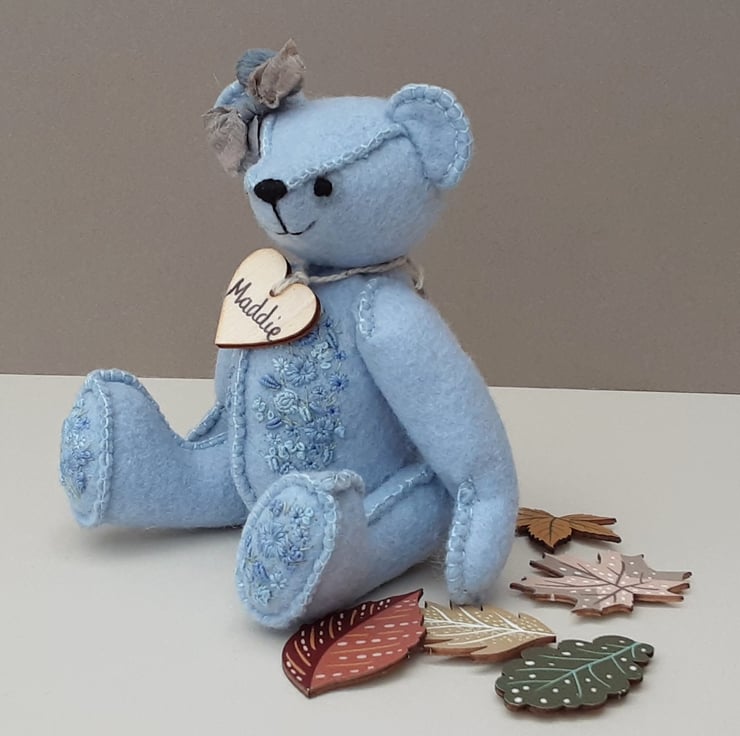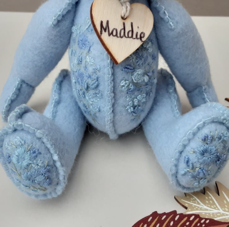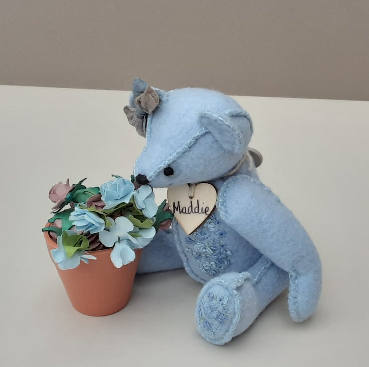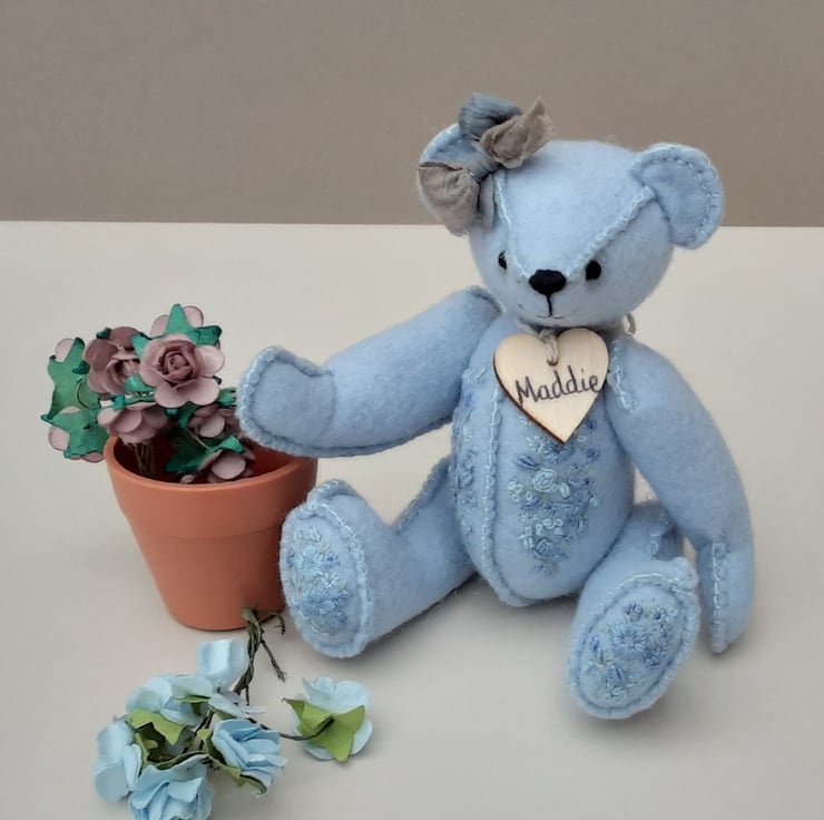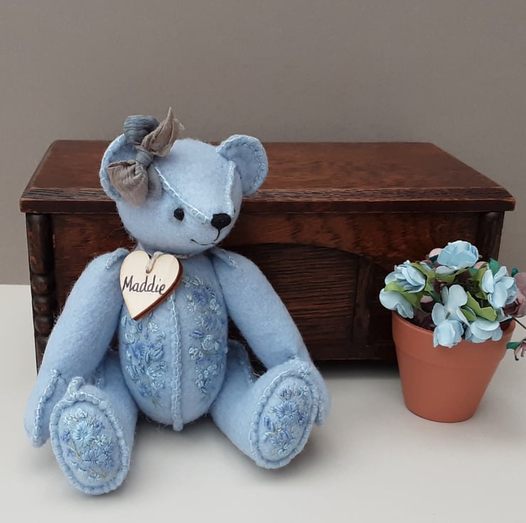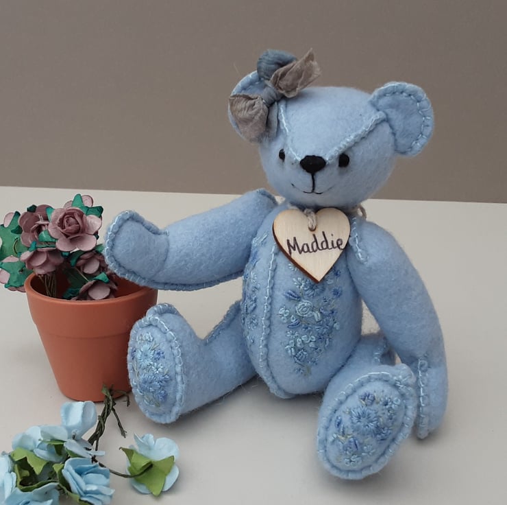 Meet Maddie, only 6" tall, a collectable hand embroidered artist bear, a hand sewn design from my new Signature range of adult collectable teddy bears. All of the bears from the new Signature range feature beautiful hand embroidered flowers to their body parts, each one is totally unique and the amount and placement of embroidery will differ from bear to bear. Made from quality wool felt they are all completely hand sewn, the seams are sewn three times to ensure stability and the seams are part of the feature and are worked on the right side of the fabric.