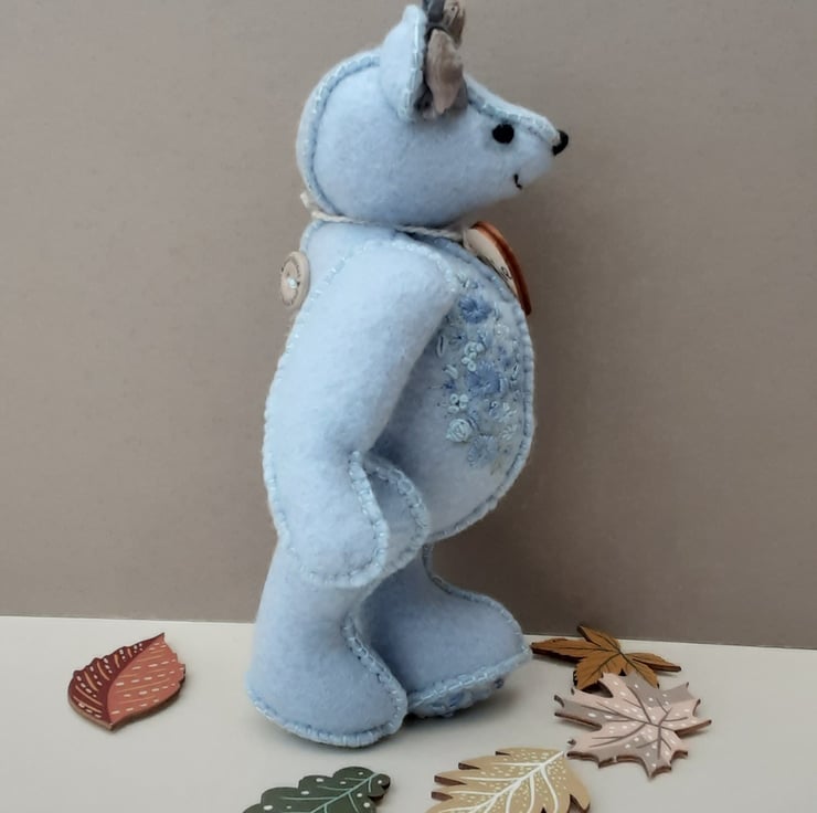 Maddie was created from a lovely powder blue wool felt with hand embroidered flowers to her body fronts, and foot pads in various blues with green stems.