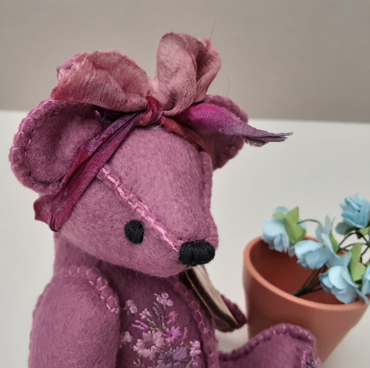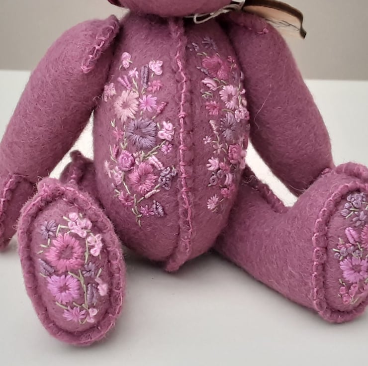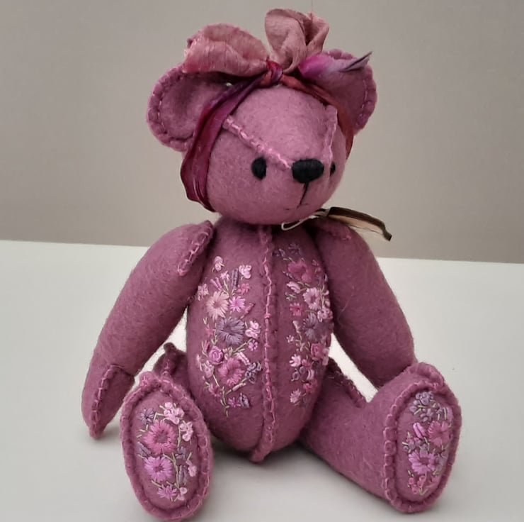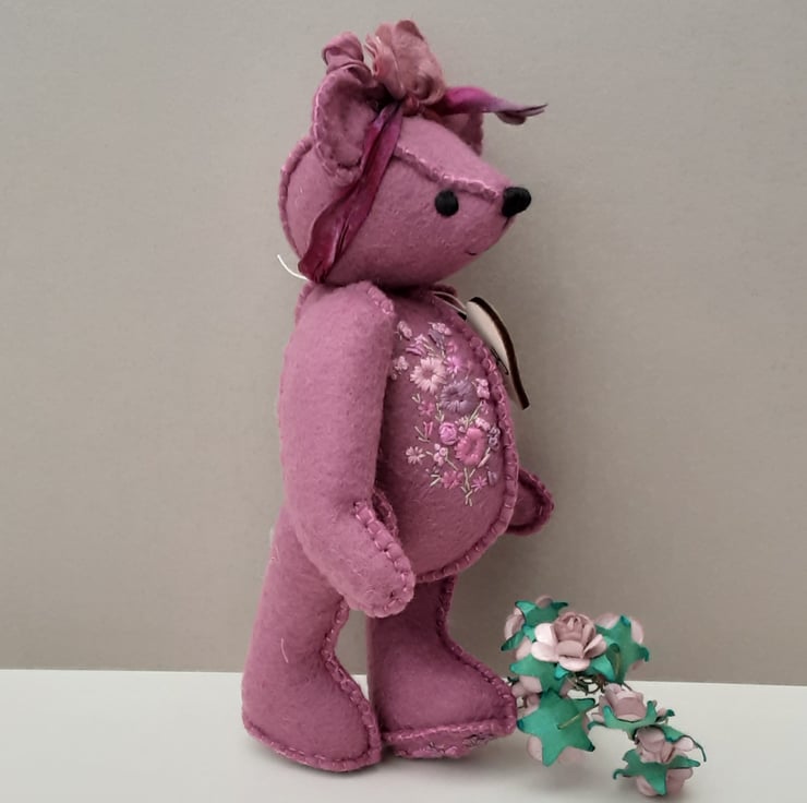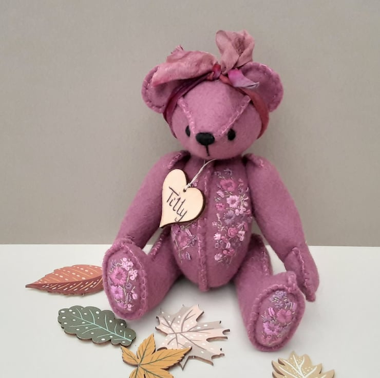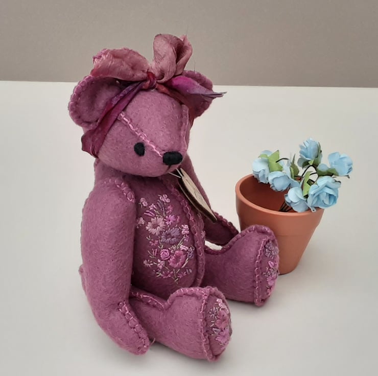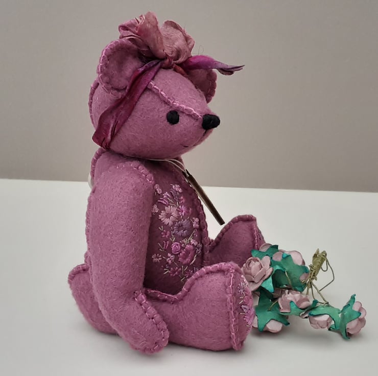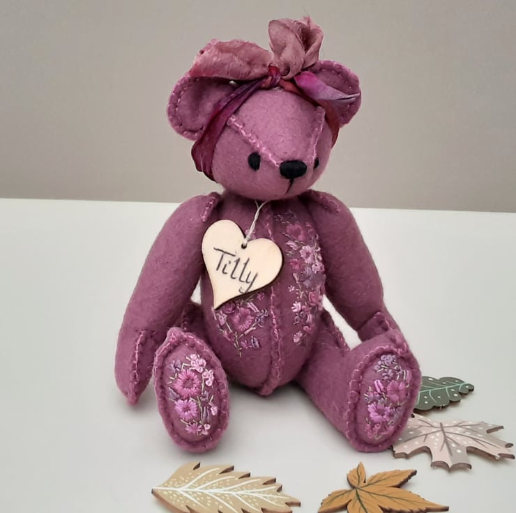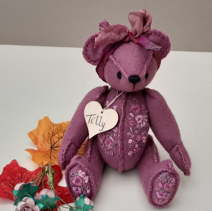 Meet Tilly, a small 6" tall artist bear in a hand sewn design from my new Signature range of adult collectable teddy bears. All of the bears from the new Signature range feature beautiful hand embroidered flowers to their body parts, each one is totally unique and the amount and placement of embroidery will differ from bear to bear. Made from quality wool felt they are all completely hand sewn, the seams are sewn three times to ensure stability and the seams are part of the feature and are worked on the right side of the fabric.