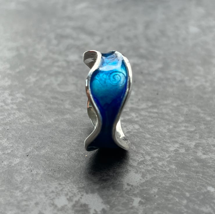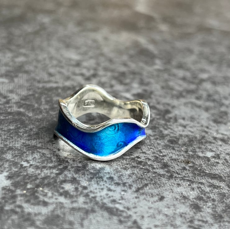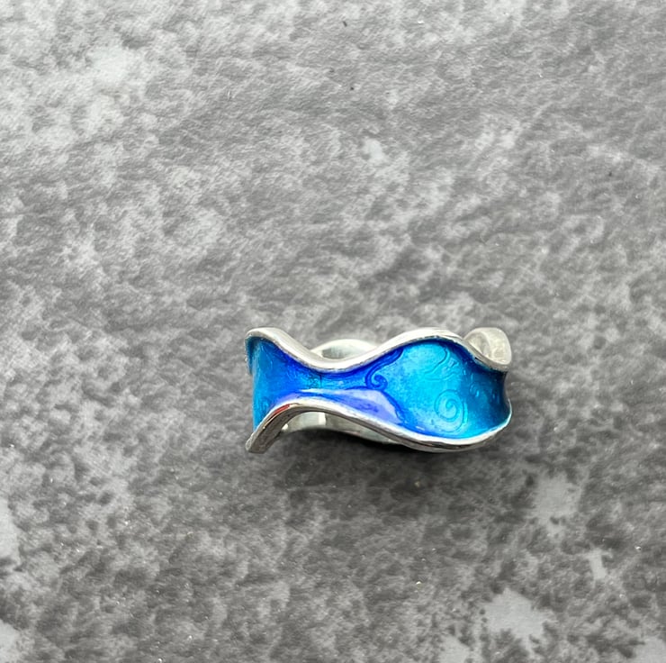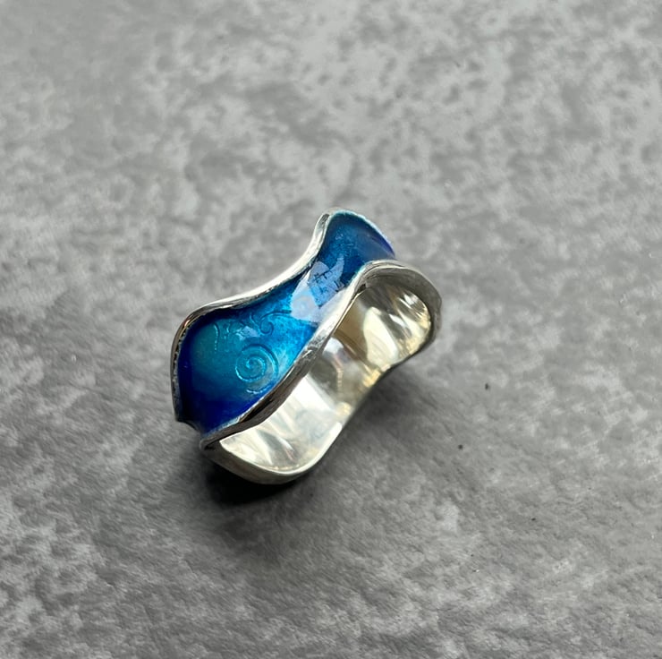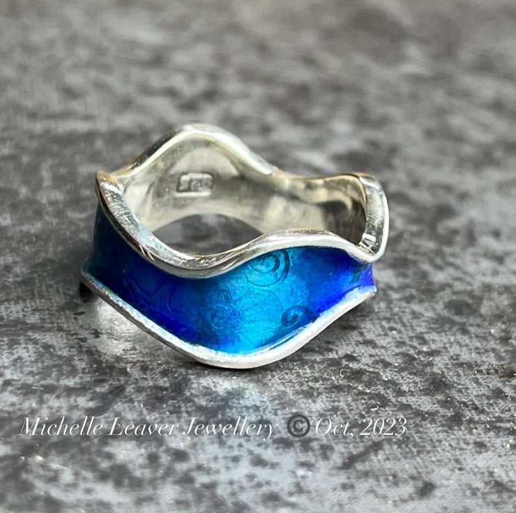 This Blue Wave Ring is made from Sterling Silver, Fine Silver and beautiful blue enamels. The widest point is approximately: 6mm. Underneath the transparent enamels you can see a sea themed pattern of shells and waves etc. Please let me know what size you require at Checkout.