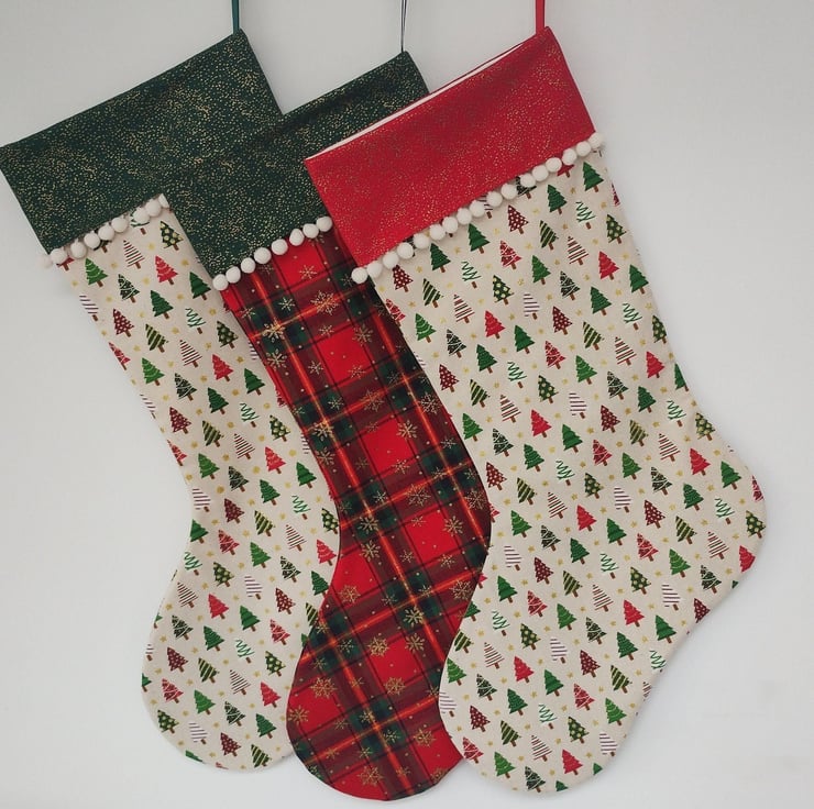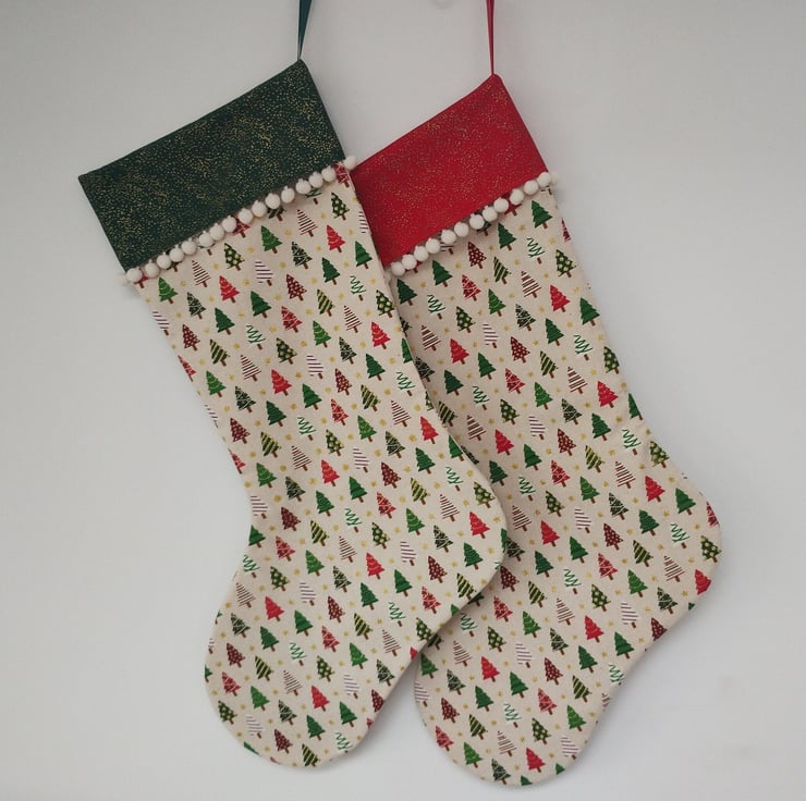 100% printed cotton fabric outer with an ivory cotton lining to give structure and strength. Seams are fully enclosed & overlocked with a durable grosgrain ribbon loop for hanging. Finished with quality bauble trim sewn around the cuff, making these hand crafted stockings more unique and fun. Care: Cold hand wash, air dry.