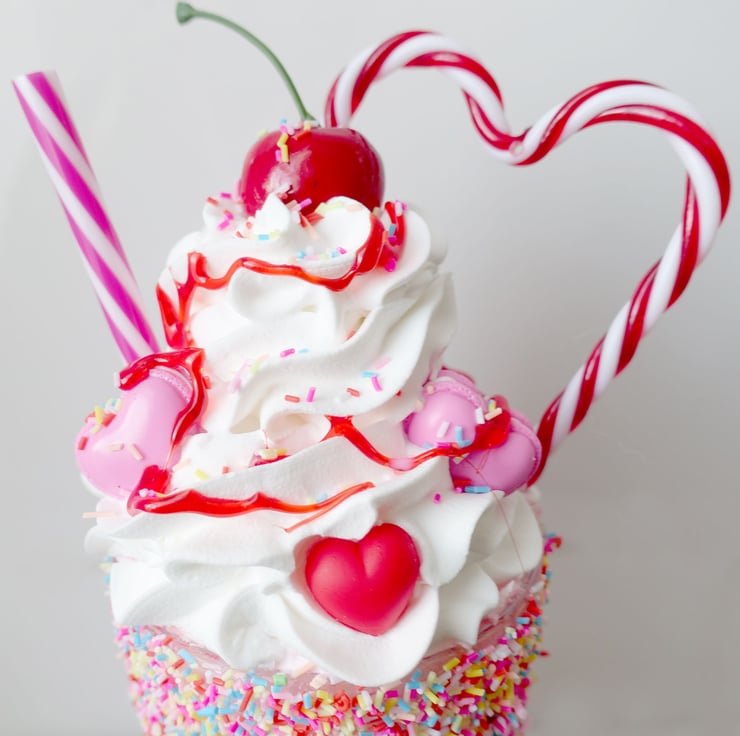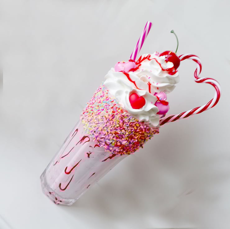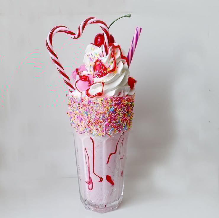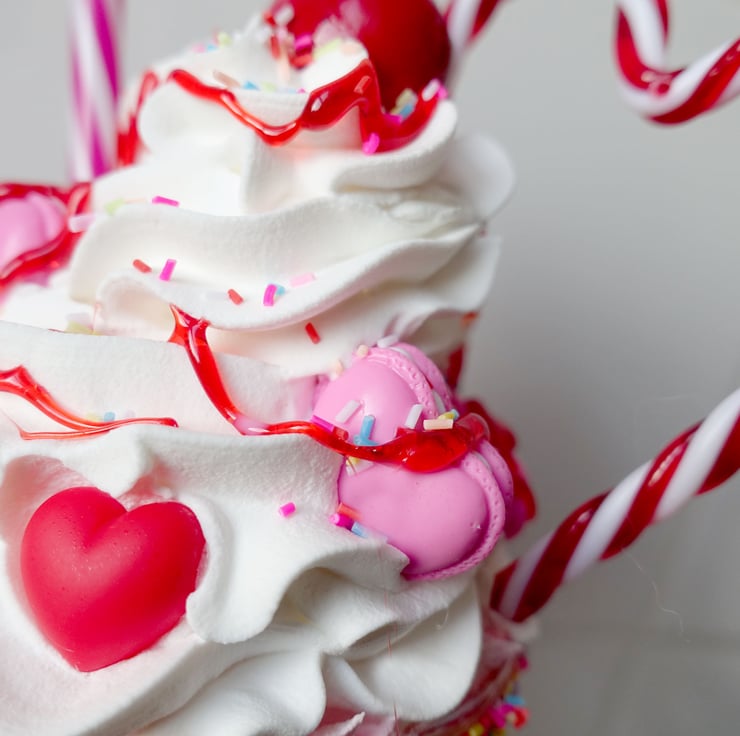 Fake large highly realistic milkshake in a tall 17 oz real glass. Decorated with fake polymer clay sprinkles, ice cream, pink fake macarons, hearts, candy stripe heart, cherry and sauce.