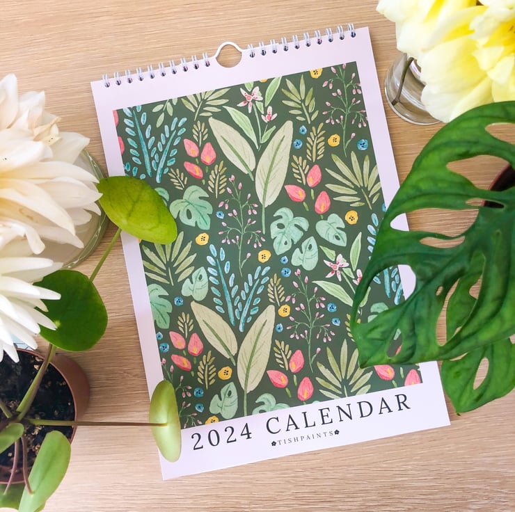 Get organised in style with the tishpaints 2024 Wall Calendar! Filled with gorgeous colourful designs inspired by plants & flowers, each month will bring a new piece of artwork into your home. Printed on recycled paper, perfect for the eco-conscious home, or a nature lover. The thumb cut shape makes it super easy to unpack and put on display in your home!