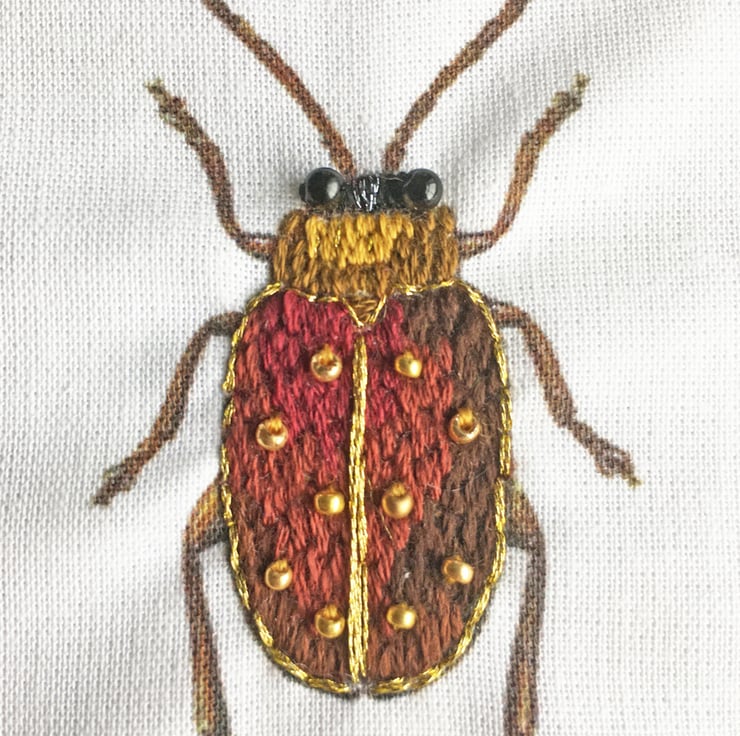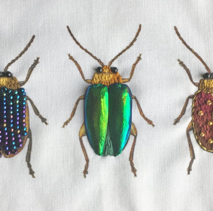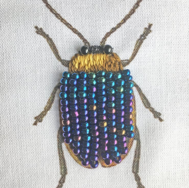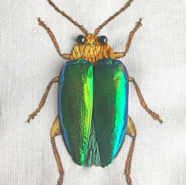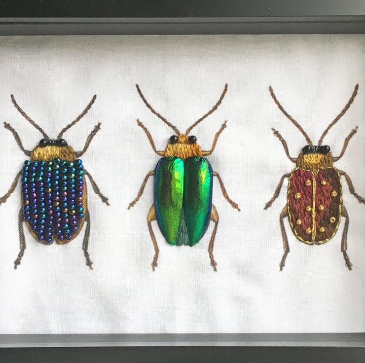 This unique little artwork was made using a fabric print of three vintage beetles. I recreated their bodies using embroidery threads, seed beads and iridescent jewel beetle wings. (The lifecycle of the adult jewel beetle is only a few weeks and they are allowed to die naturally before their wings are harvested to use in jewellery and embroidery.)