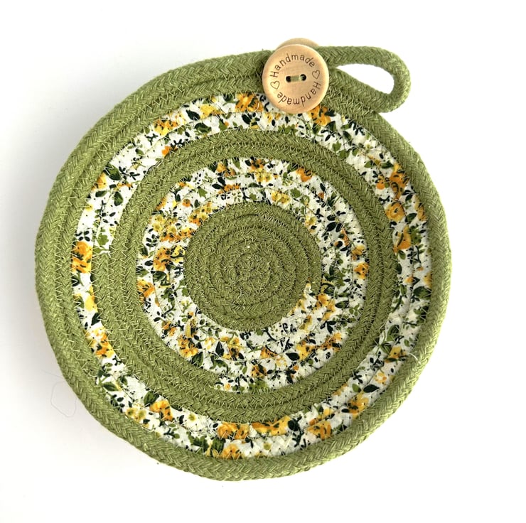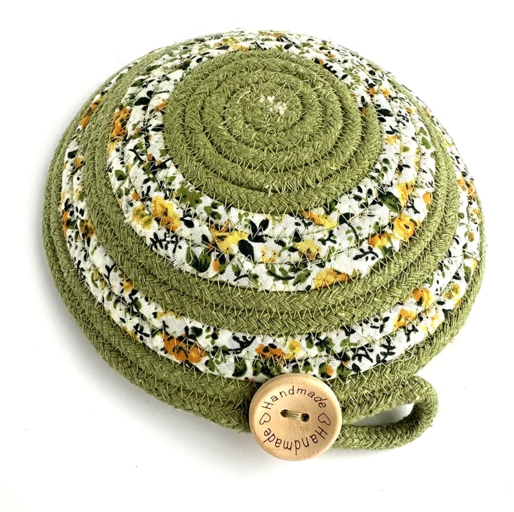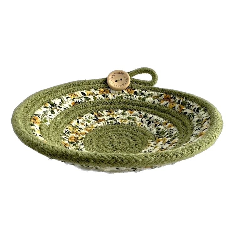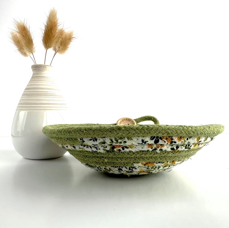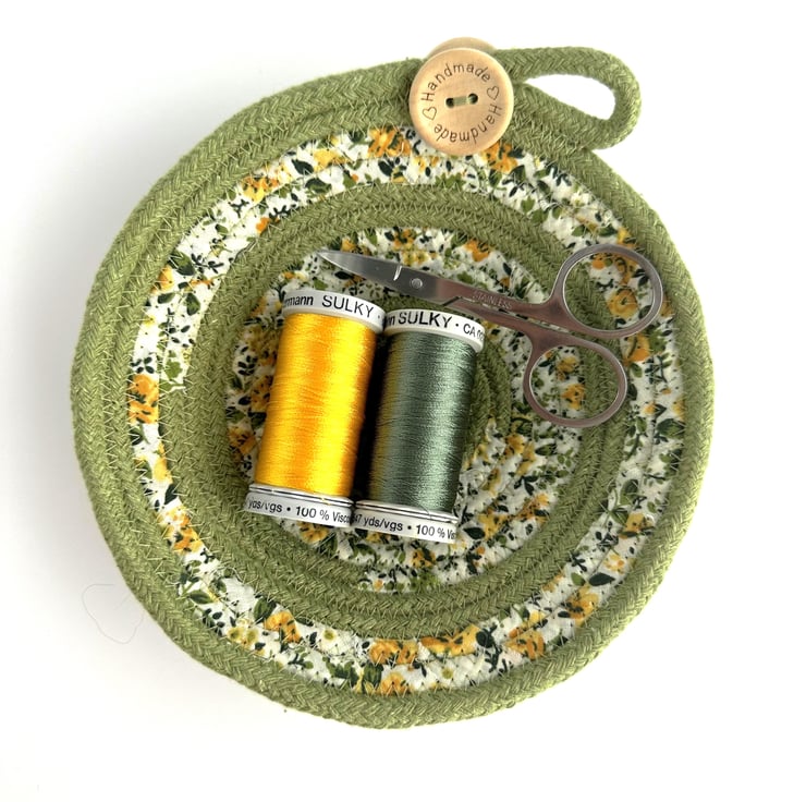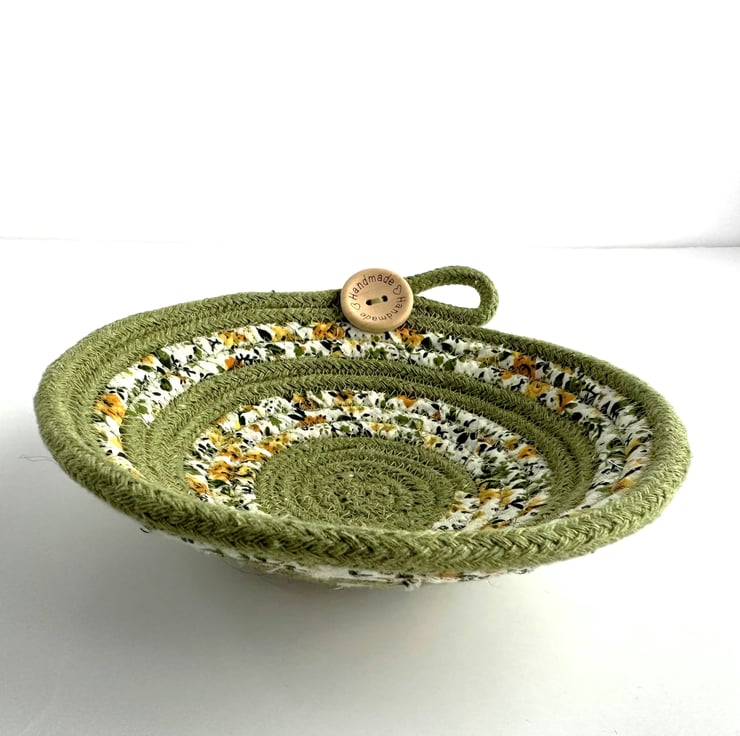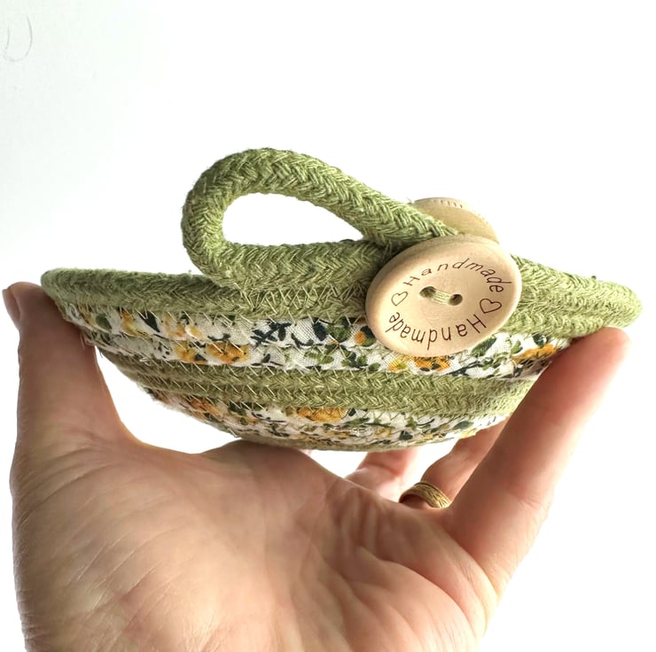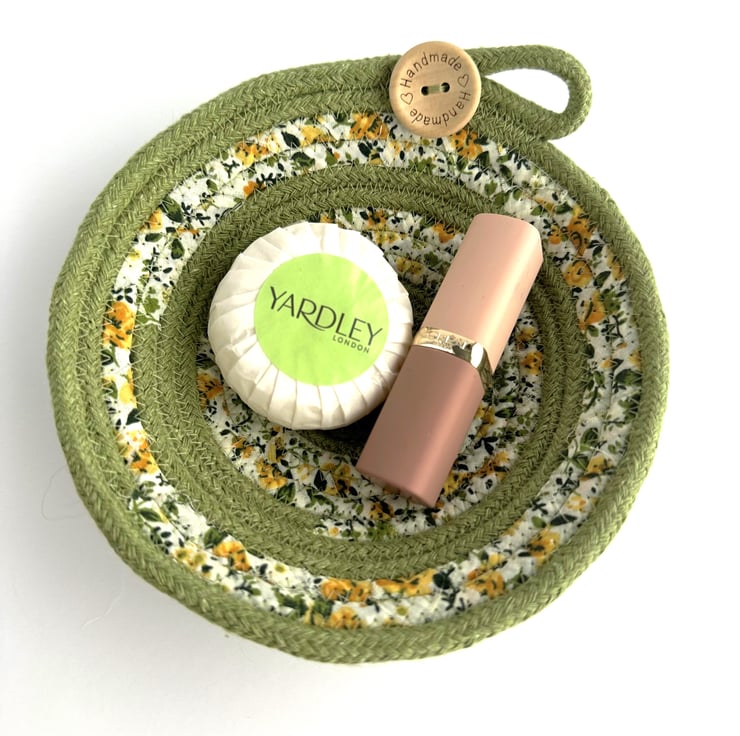 Small rope bowl in sage green with floral pattern. This fresh-looking little trinket bowl has been made from cotton rope, which has been coiled, whilst being stitched on my sewing machine, and formed into a bowl shape. During the coiling process, sections of the rope have been wrapped with strips of fabric, adding an interesting striped effect to the finished dish. The rope is a lovely fresh sage green colour, and the fabric is cream with a ditsy floral pattern in shades of green and golden yellow. The dish has been finished with a decorative loop and embellished with two wooden buttons, one on the inside and one on the outside of the bowl. The natural wood buttons are inscribed with the word “Handmade” and two tiny hearts.