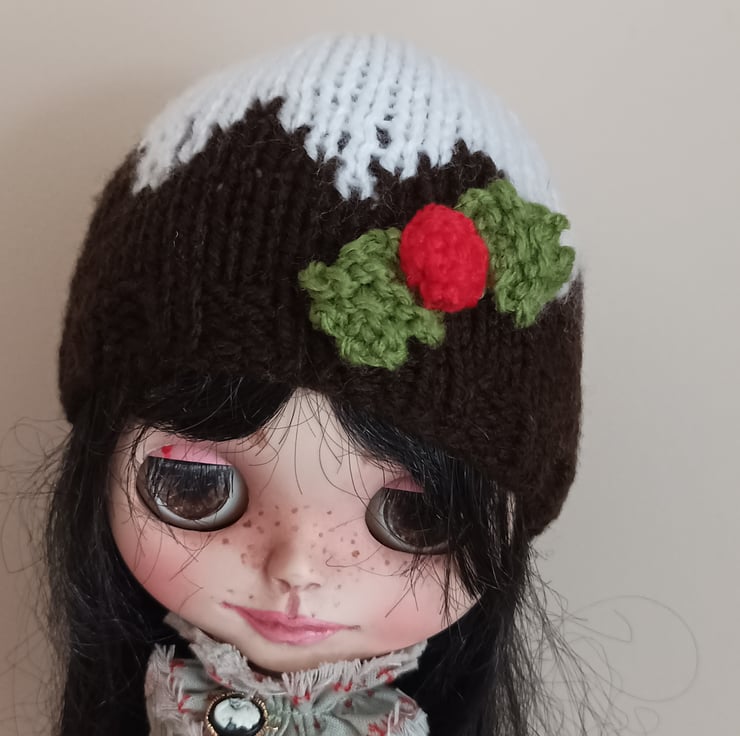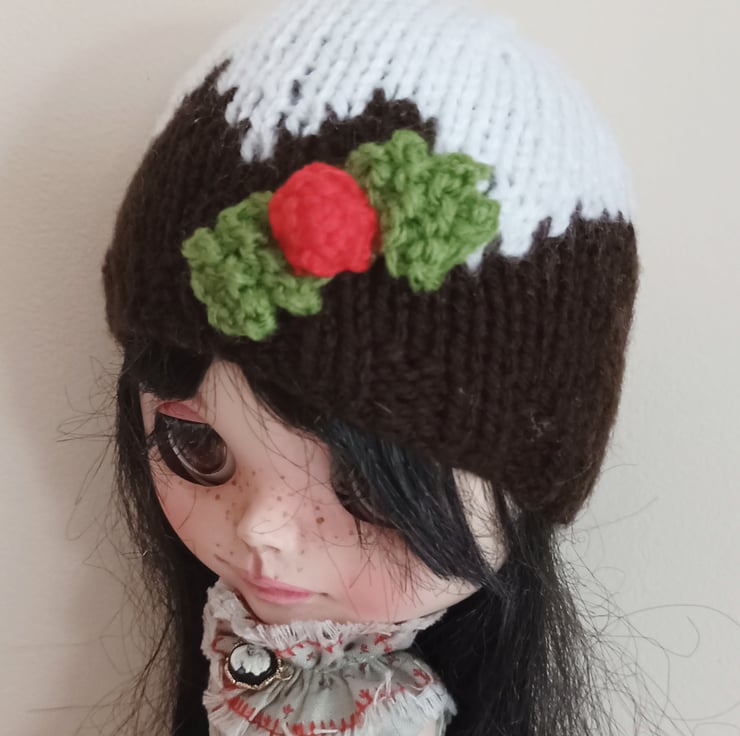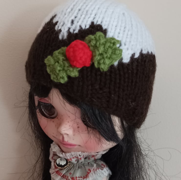 Xmas pudding hat to fit 12" Blythe dolls. Knitted in 100 %acrylic yarn.