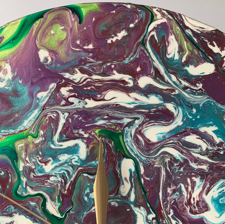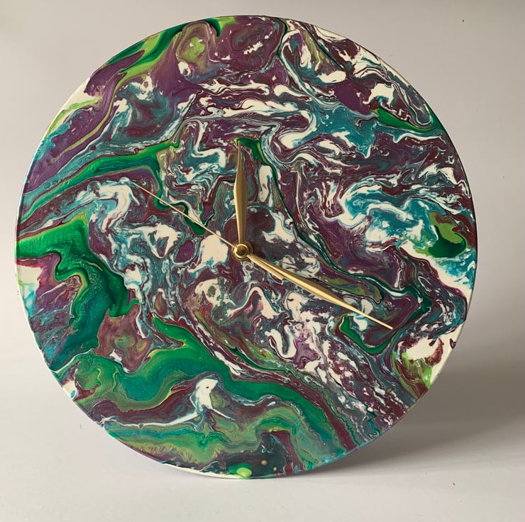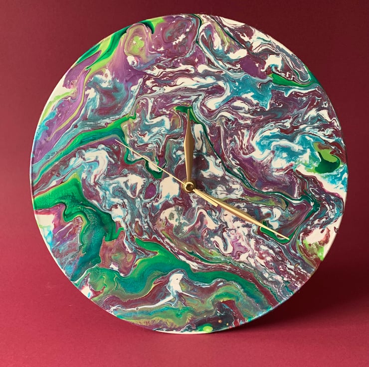 This 12”/30cm wall clock is made from an LP vinyl record and given a new lease of life to sing a different tune! It has been painted with acrylics using the ‘pour’ method and varnished to a gloss finish. The back has been felted to give a clean look. The quartz mechanism is ticking, and it has gold coloured hands. It requires 1xAA alkaline battery.