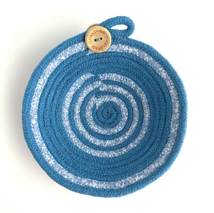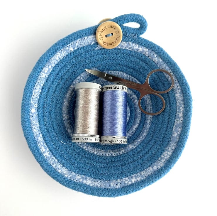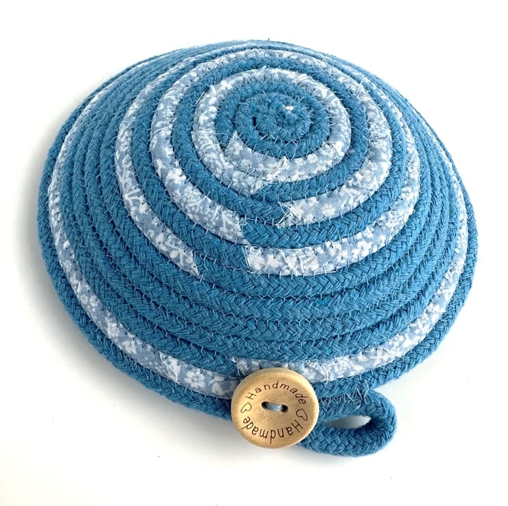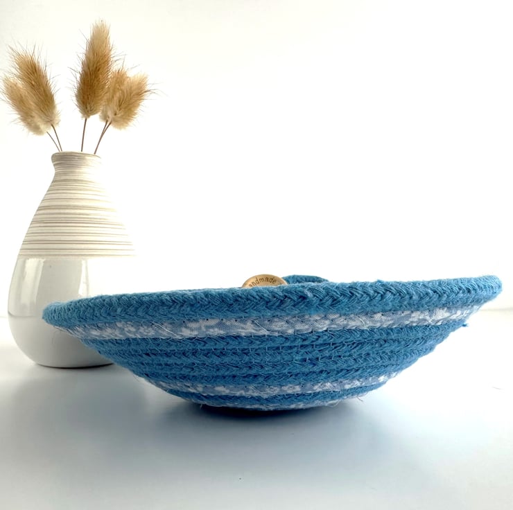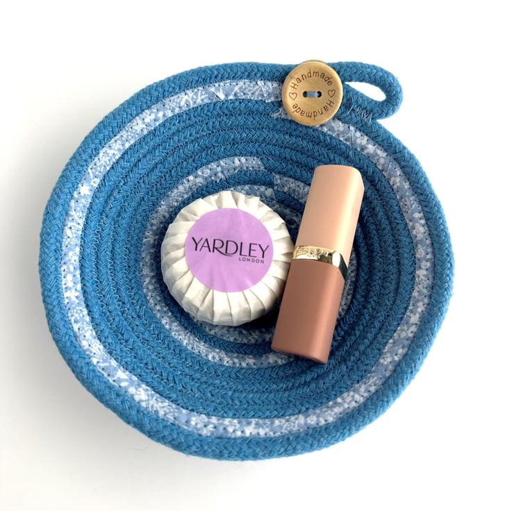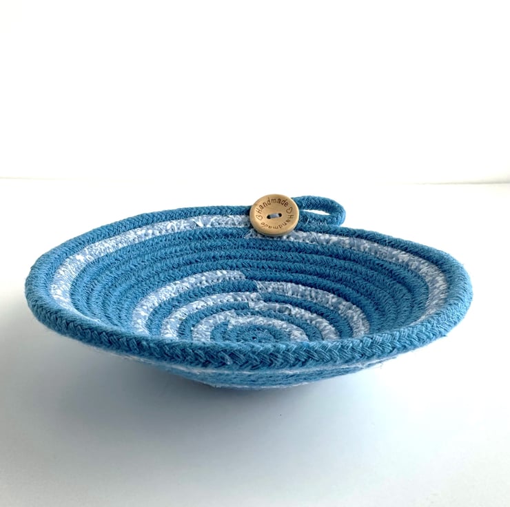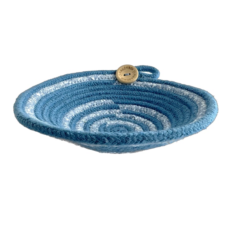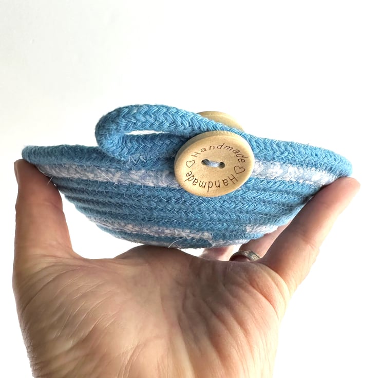 Small blue coiled rope bowl with pale blue trim. This lovely little textile trinket bowl has been made from cotton rope, which has been coiled, whilst being stitched on my sewing machine, and formed into a bowl shape. During the sewing process, sections of the rope have been wrapped with strips of fabric, adding a pretty striped effect to the finished dish. The rope is a lovely mid blue colour, and the fabric is a pale pastel blue with a white ditsy floral print pattern. The dish has been finished with a decorative loop and two wooden buttons, one on the inside and one on the outside of the bowl. The natural wood buttons are inscribed with the word “Handmade” and two tiny hearts.