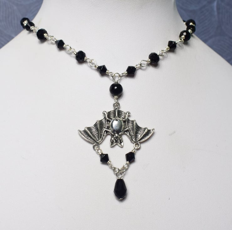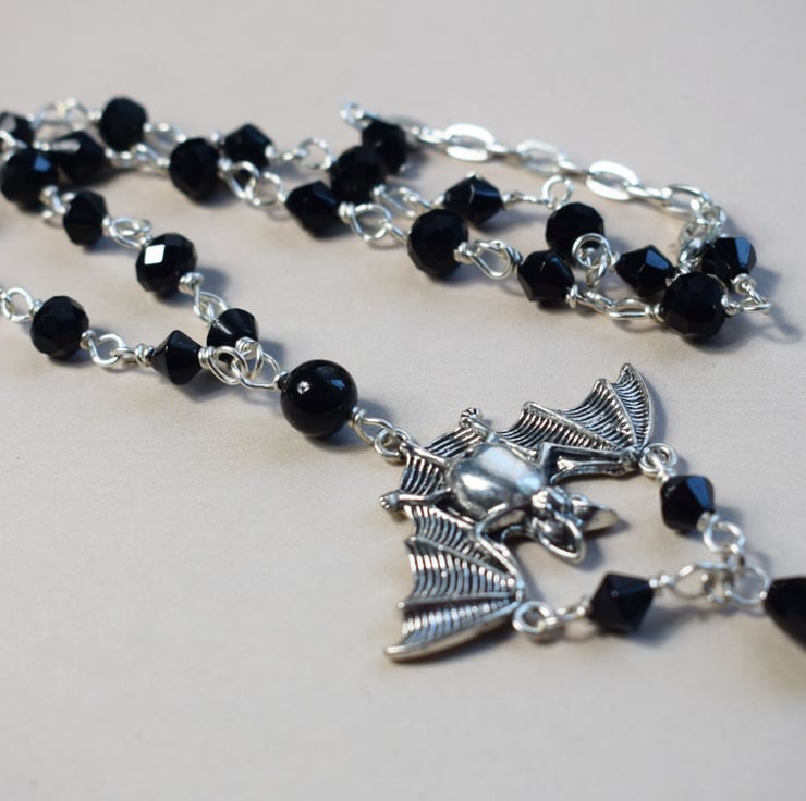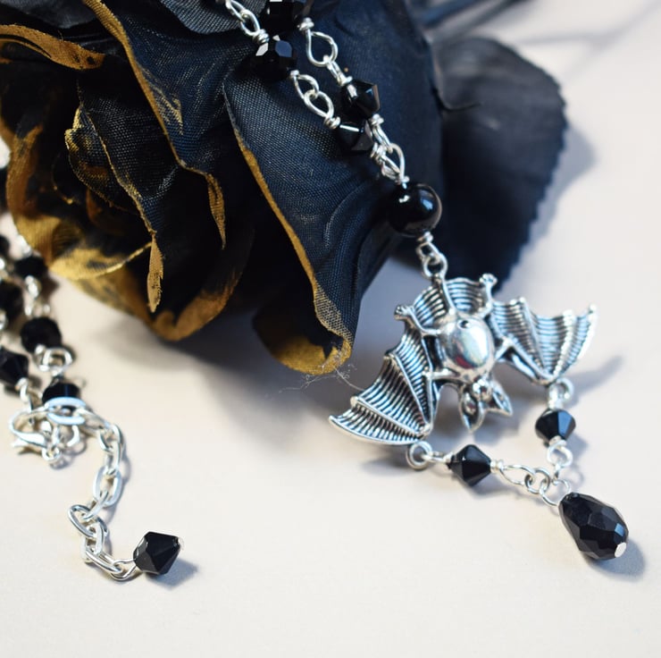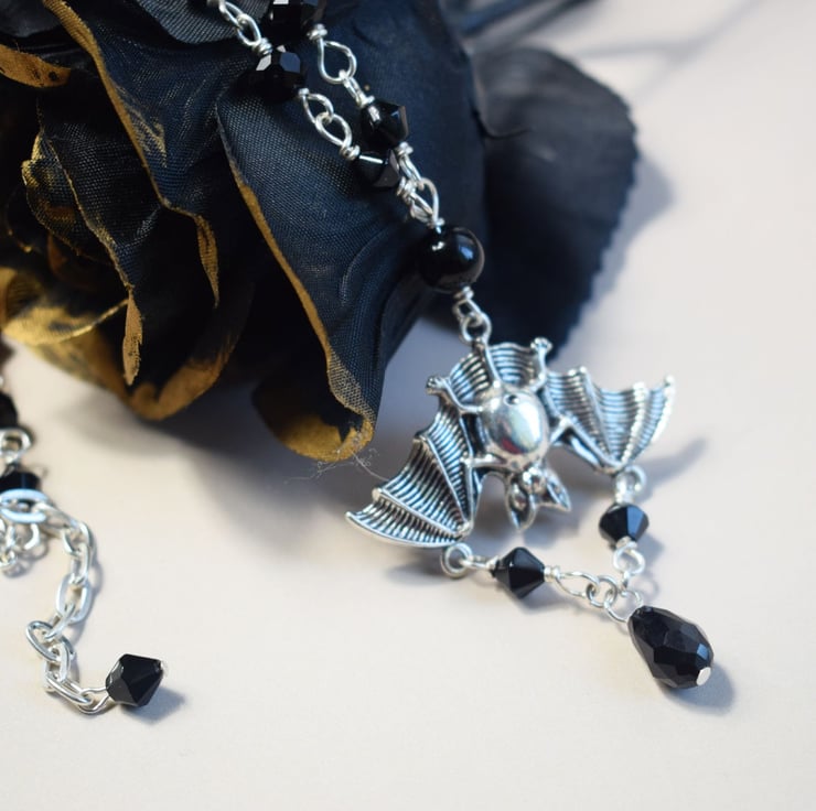 Gorgeously gothic and ready to adorn your neck this bat choker necklace with black glass beads is perfect for moon gazers, night dwellers and bat lovers alike!