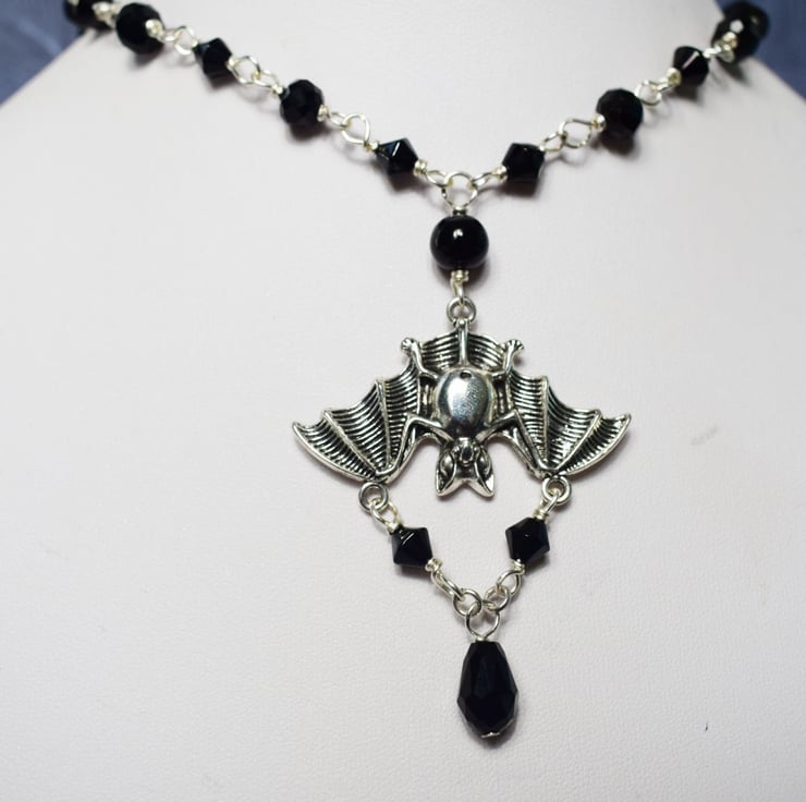 This choker is made with black glass beads securely wire wrapped together and at the front is a bat hanging upside down. Hanging from this is a black teardrop bead.