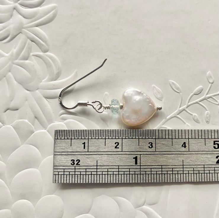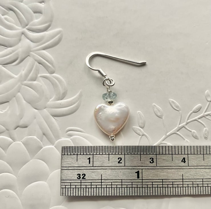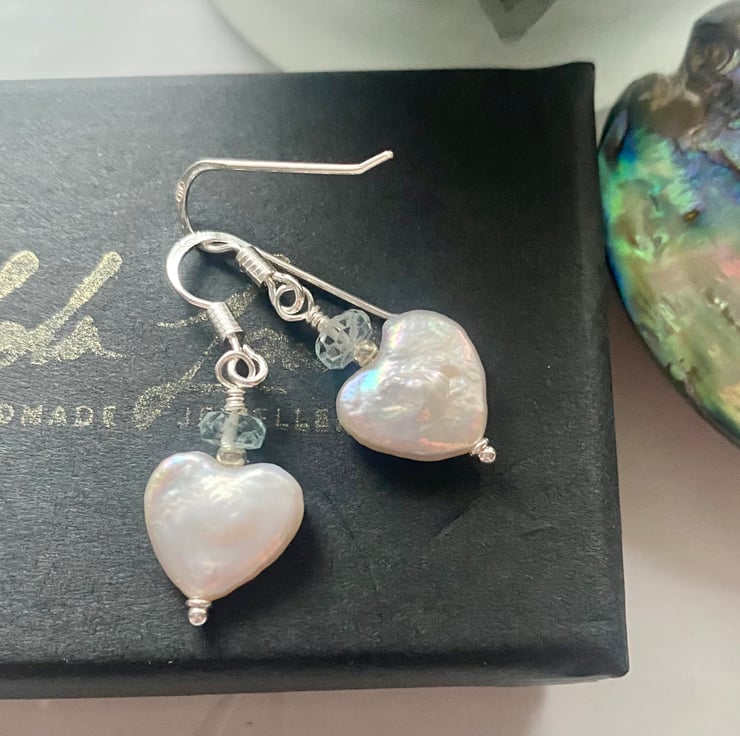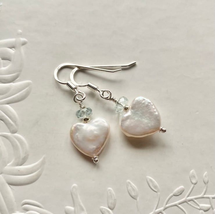 Gorgeous handmade Aquamarine and white Pearl heart earrings featuring genuine faceted Aquamarine rondelles, heart shaped freshwater cultured coin Pearls and 925 sterling silver findings. I have finished the earrings with 925 sterling silver shepherd hooks.