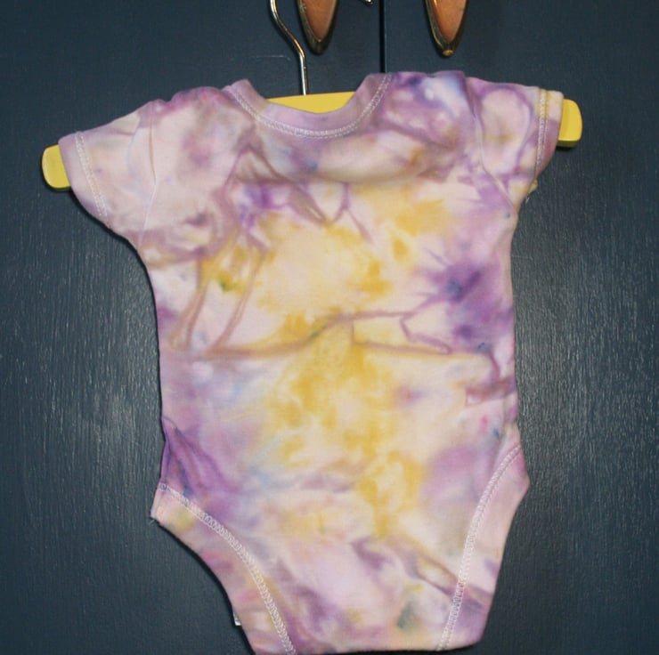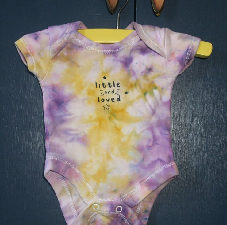 A very cute short sleeve vest, ice-dyed to highlight the slogan 'Little and Loved'. The yellow and purple patterns will look incredibly cute on! Size Tiny Baby. This is a second chance item.