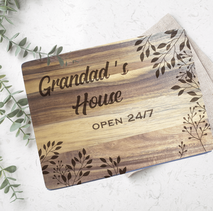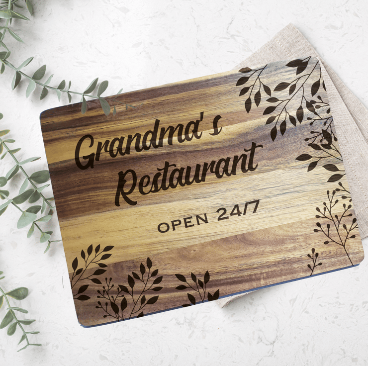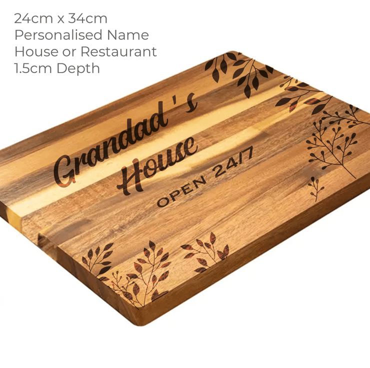 Personalised and beautifully engraved wooden chopping board. Add any name/word with a choice between House or Restaurant to this cutting board and make an extra special gift for family and friends.